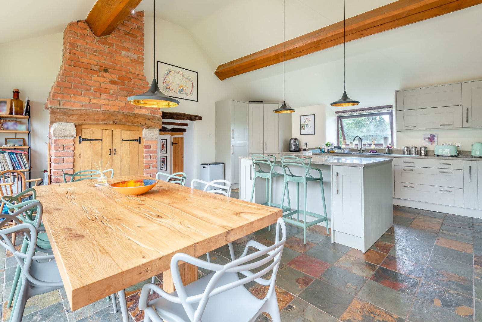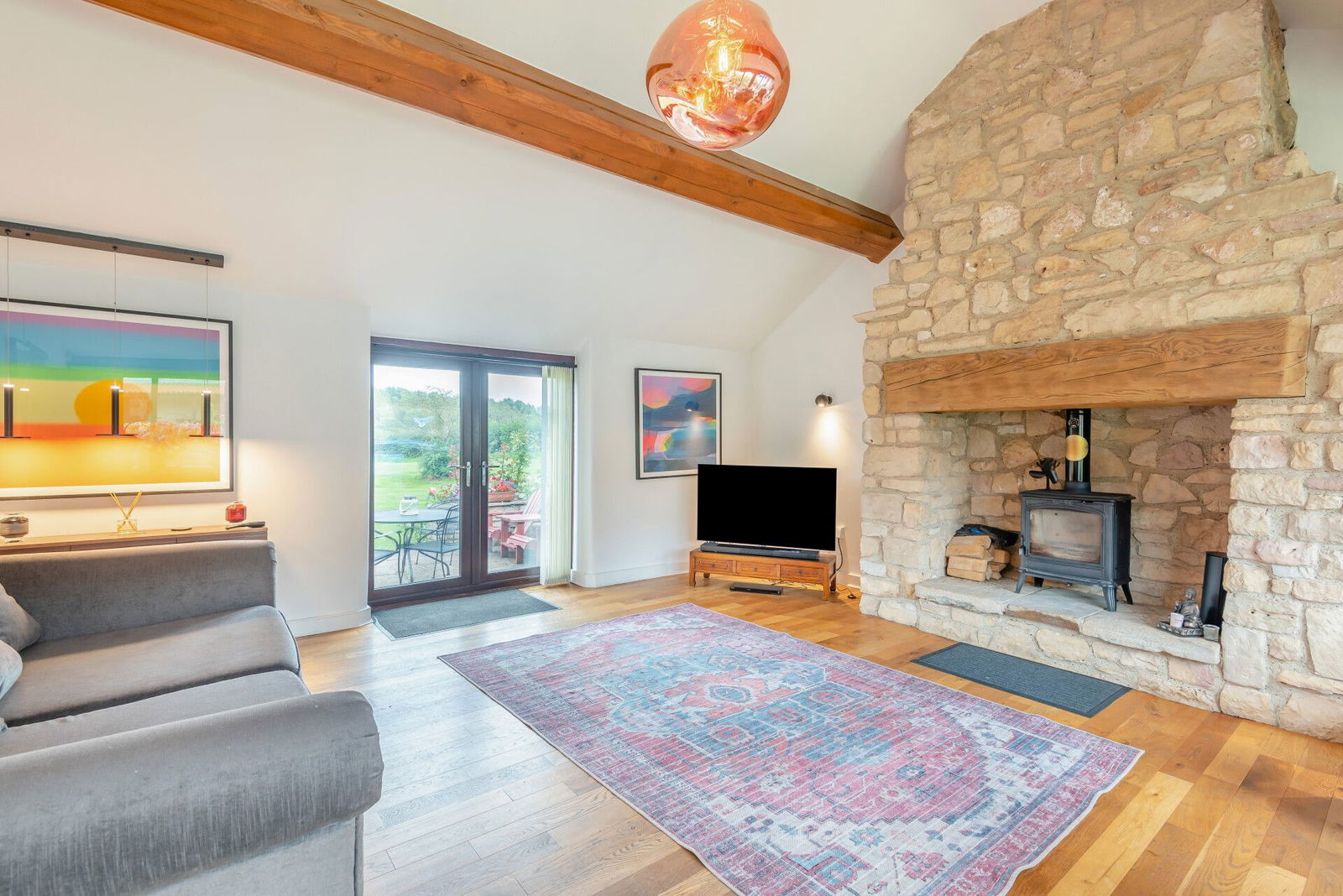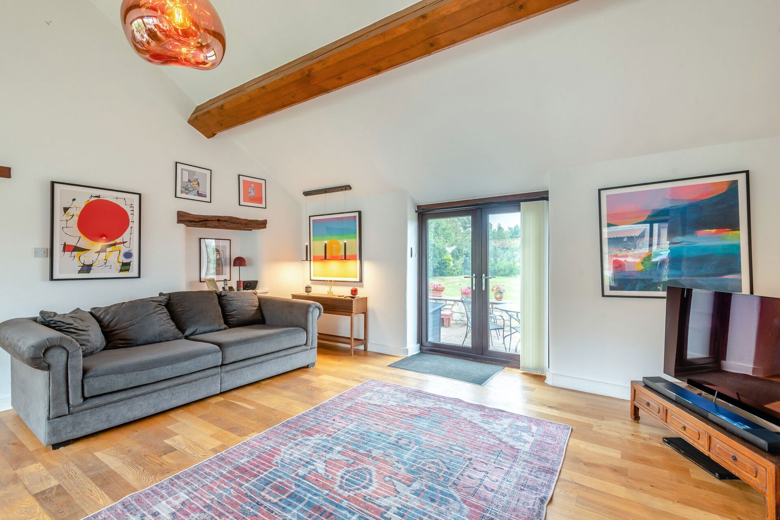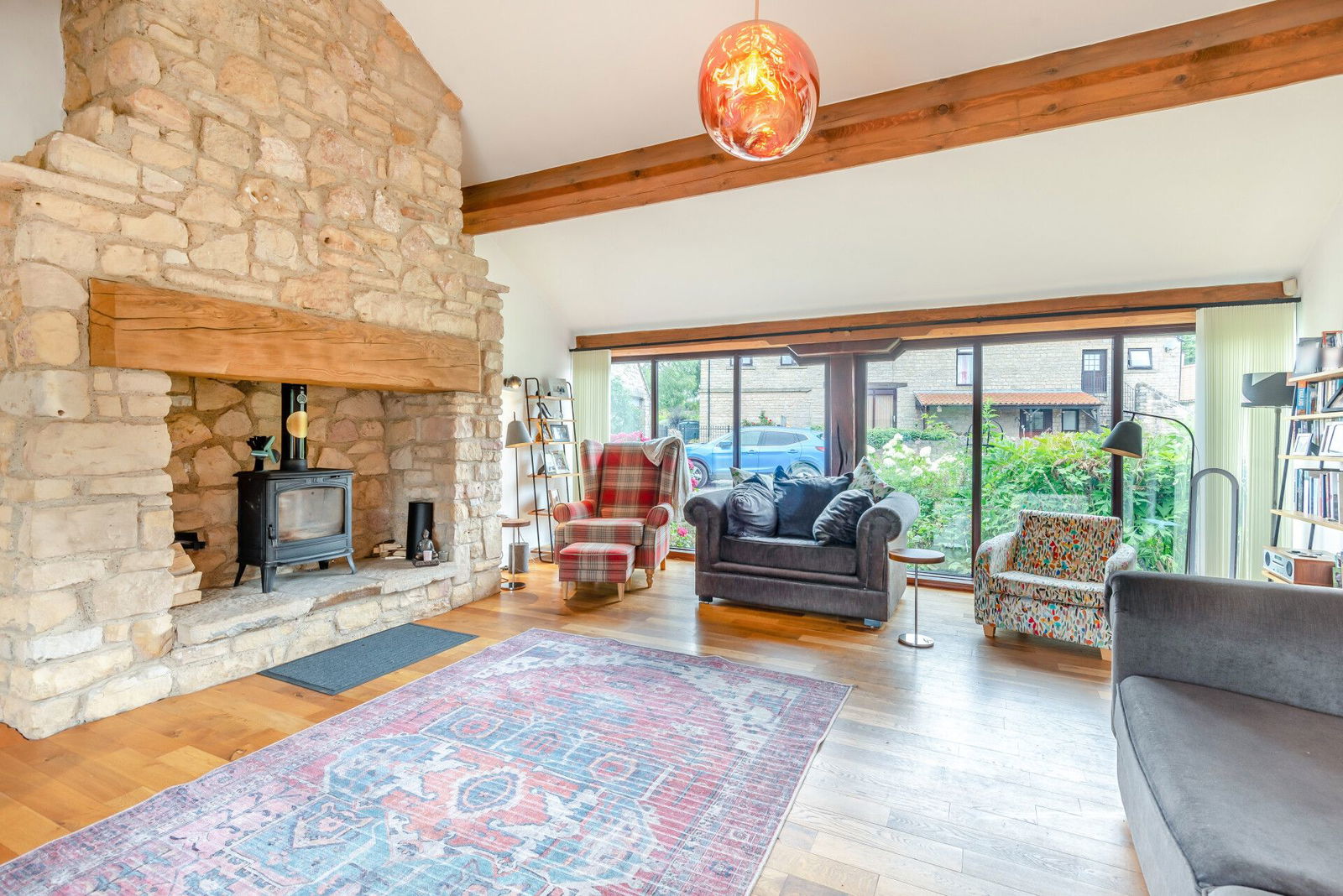 The lounge has French doors opening directly onto a South facing terrace that overlooks the rear garden. The front aspect enjoys full height glazing inviting natural light indoors whilst the room has exposed beams to the ceiling and a stunning inglenook stone fireplace which is home to a wood burning stove.