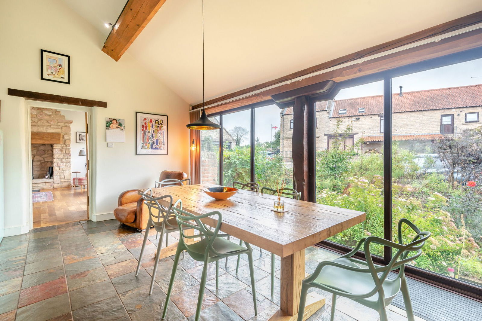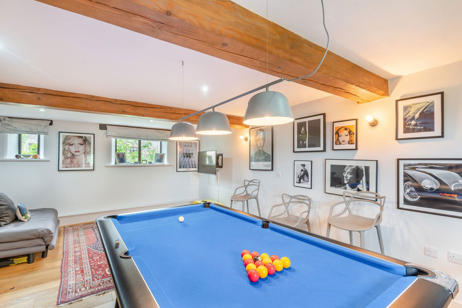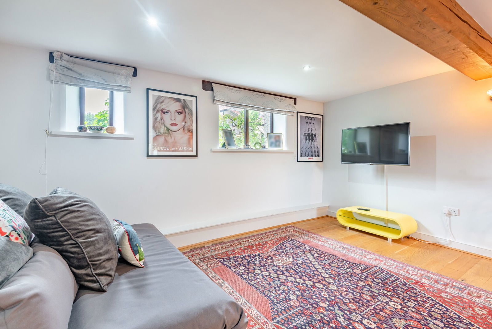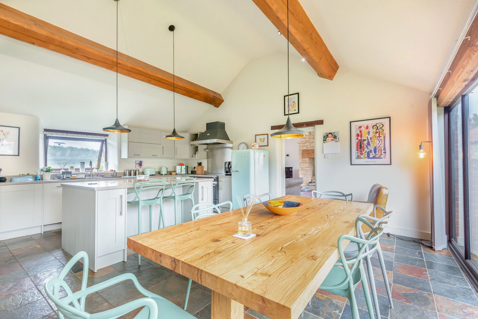 The lounge has French doors opening directly onto a South facing terrace that overlooks the rear garden. The front aspect enjoys full height glazing inviting natural light indoors whilst the room has exposed beams to the ceiling and a stunning inglenook stone fireplace which is home to a wood burning stove.