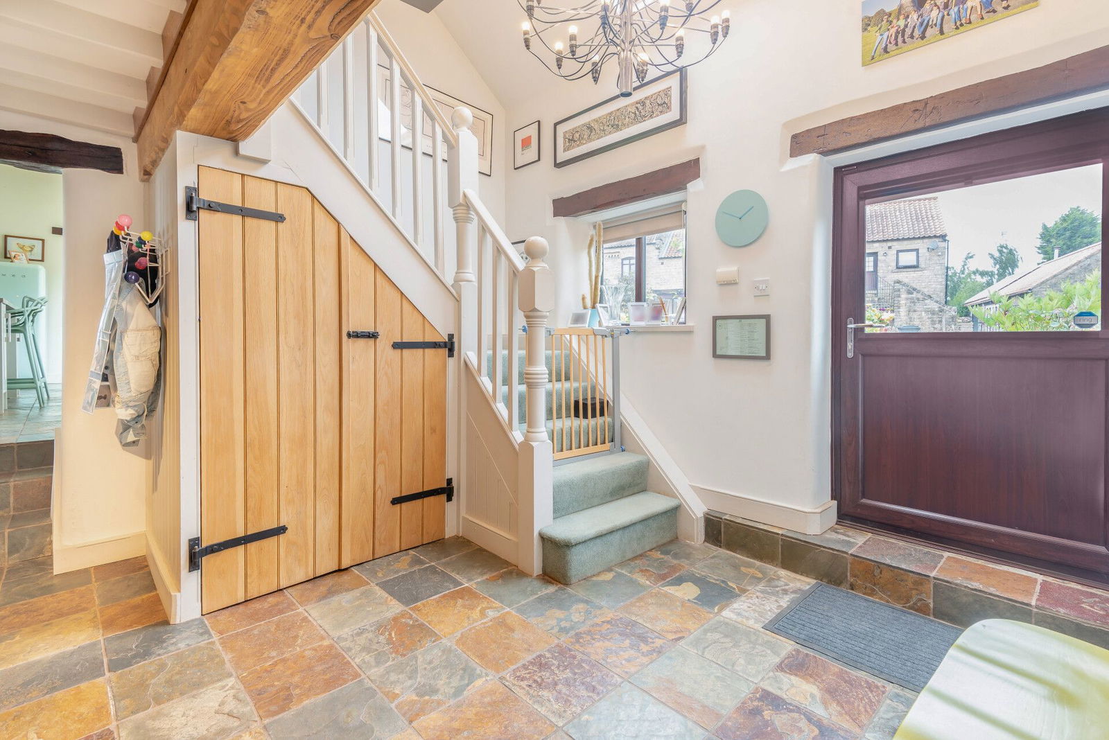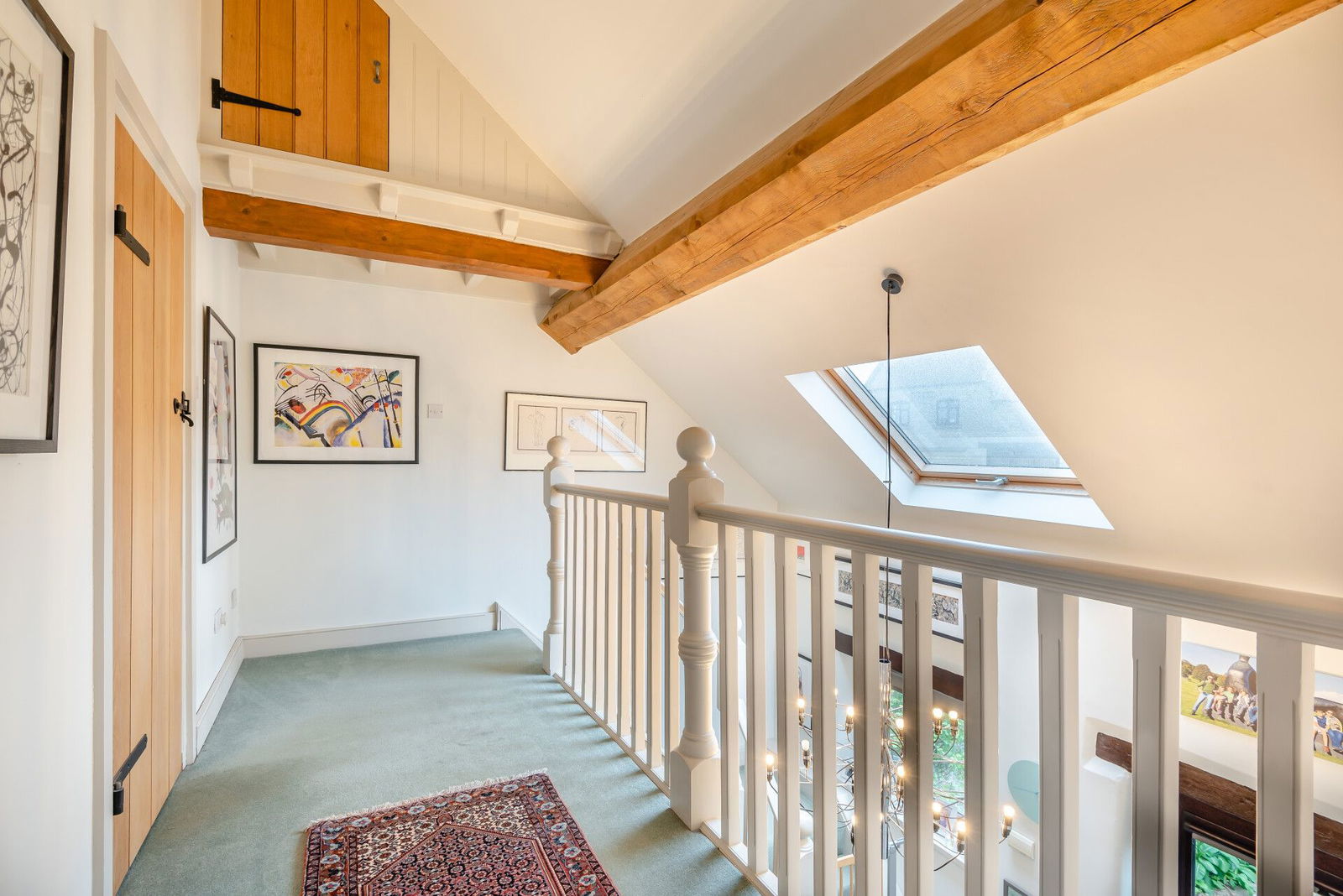 An entrance door to the front aspect opens into a spacious reception hall which enjoys a double storey ceiling height exposed into the apex of the building overlooked by the first floor galleried landing; exposed beams are on display; a window overlooks the front courtyard and there is a skylight window. There is a useful storage cupboard beneath the stairs and access to a utility and cloakroom which has a low flush W.C, and a wash hand basin. A work surface has plumbing for an automatic washing machine beneath whilst an internal cupboard is home to the pressurised cylinder tank and manifolds for the underfloor heating.