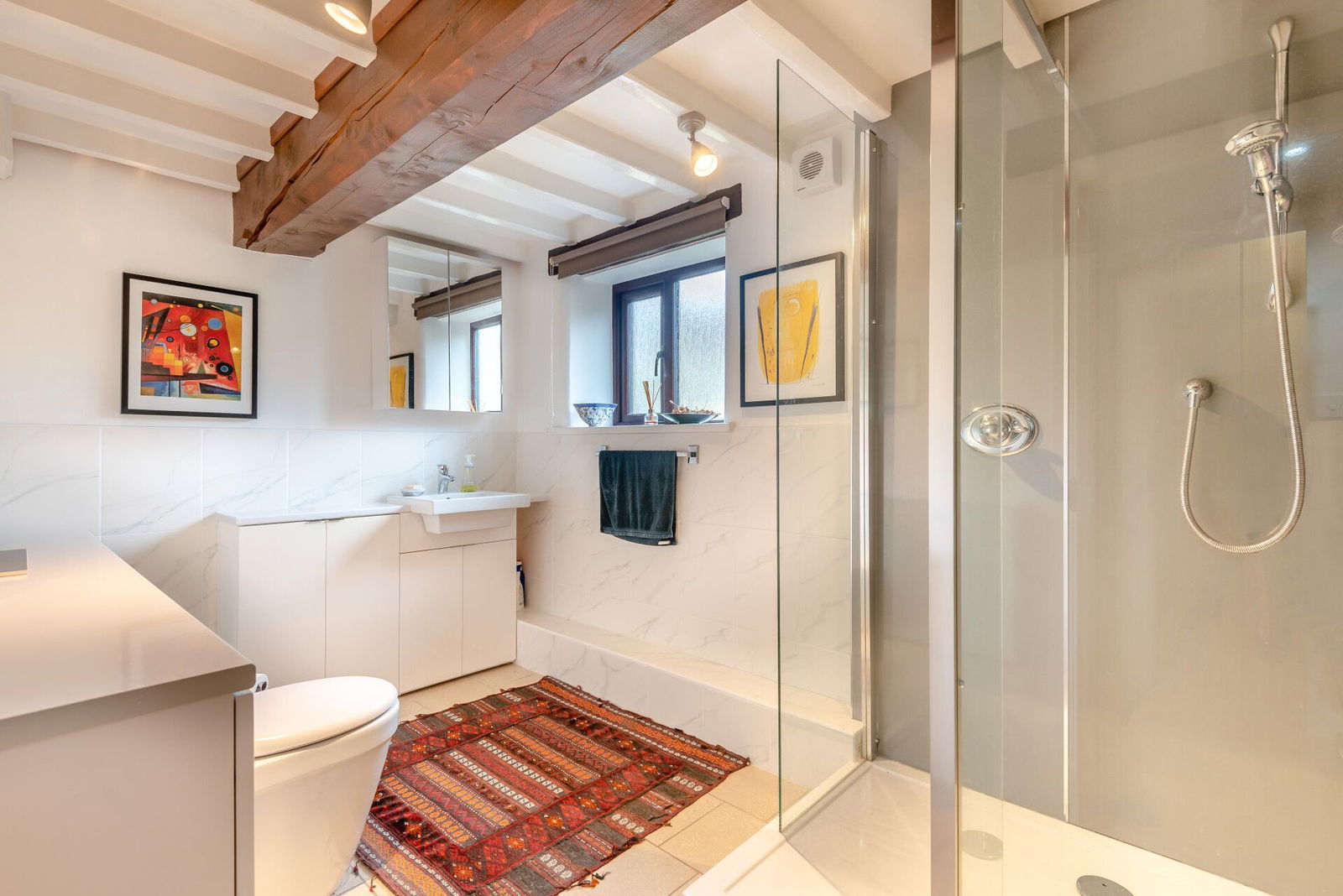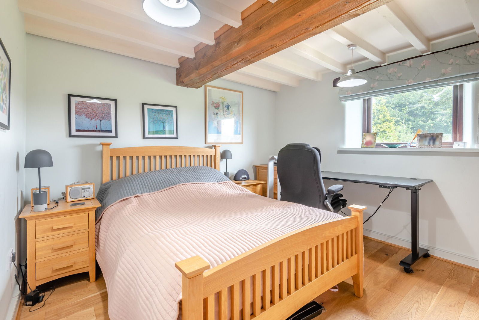 A second ground floor bedroom enjoys double proportions, situated to the rear aspect to the property with a window overlooking the gardens, an exposed engineered oak floor, beams to the ceiling and an en-suite suite shower room presented with a modern three piece suite, and a frosted window to the rear elevation.