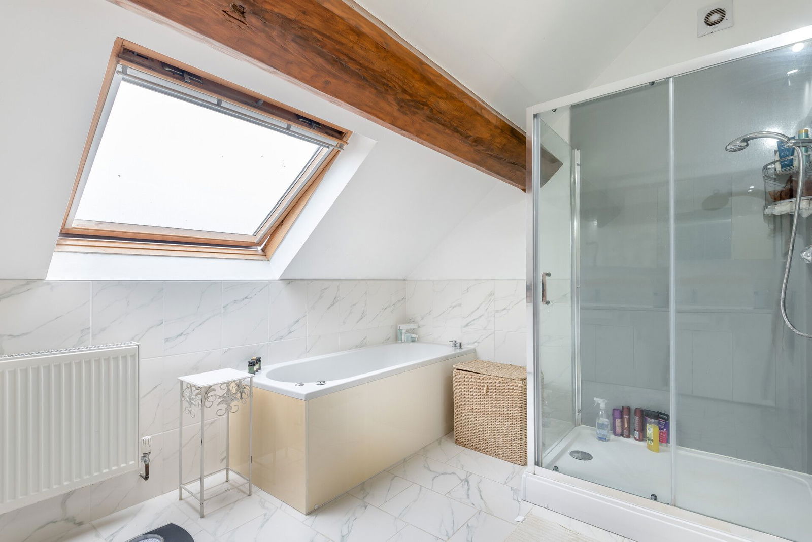 The family bathroom offers generous accommodation presenting a four piece suite consisting of a jacuzzi bath, double shower, a low flush W.C and a wash hand basin set to a vanity surround. This room has complementary tiling to the walls and floor, an exposed beam and a Velux window to the rear aspect.