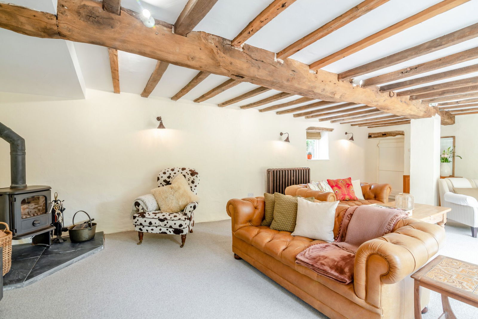 The sitting room offers exceptional accommodation, a lovely, light and airy room with windows to three aspects and tri-folding doors opening directly on to a garden terrace. A further door opens to the garden. This room displays exposed beams, has traditional cast iron radiators and a multi-fuel stove to a tiled hearth.