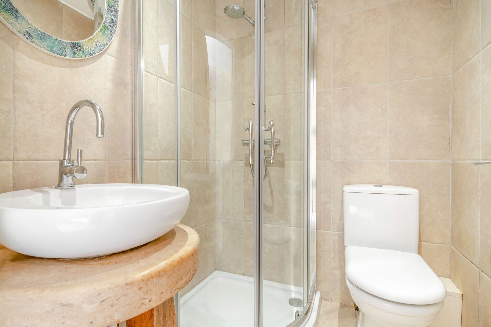The bathroom has a 4-piece suite incorporating a shower, a free-standing roll top bath, a wash hand basin set to a vanity cupboard and a low flush W.C, a frosted window and a traditional style radiator with chrome towel surround.