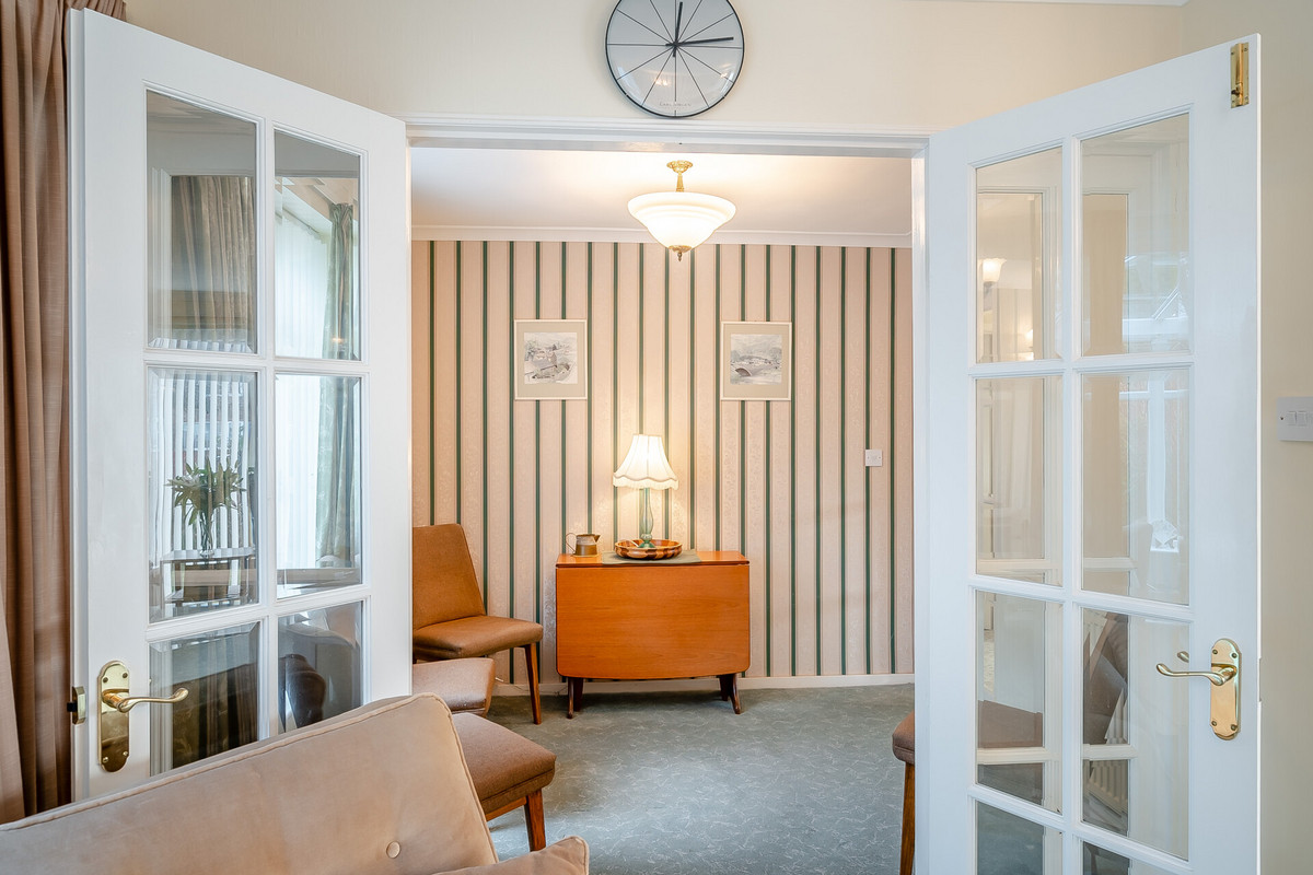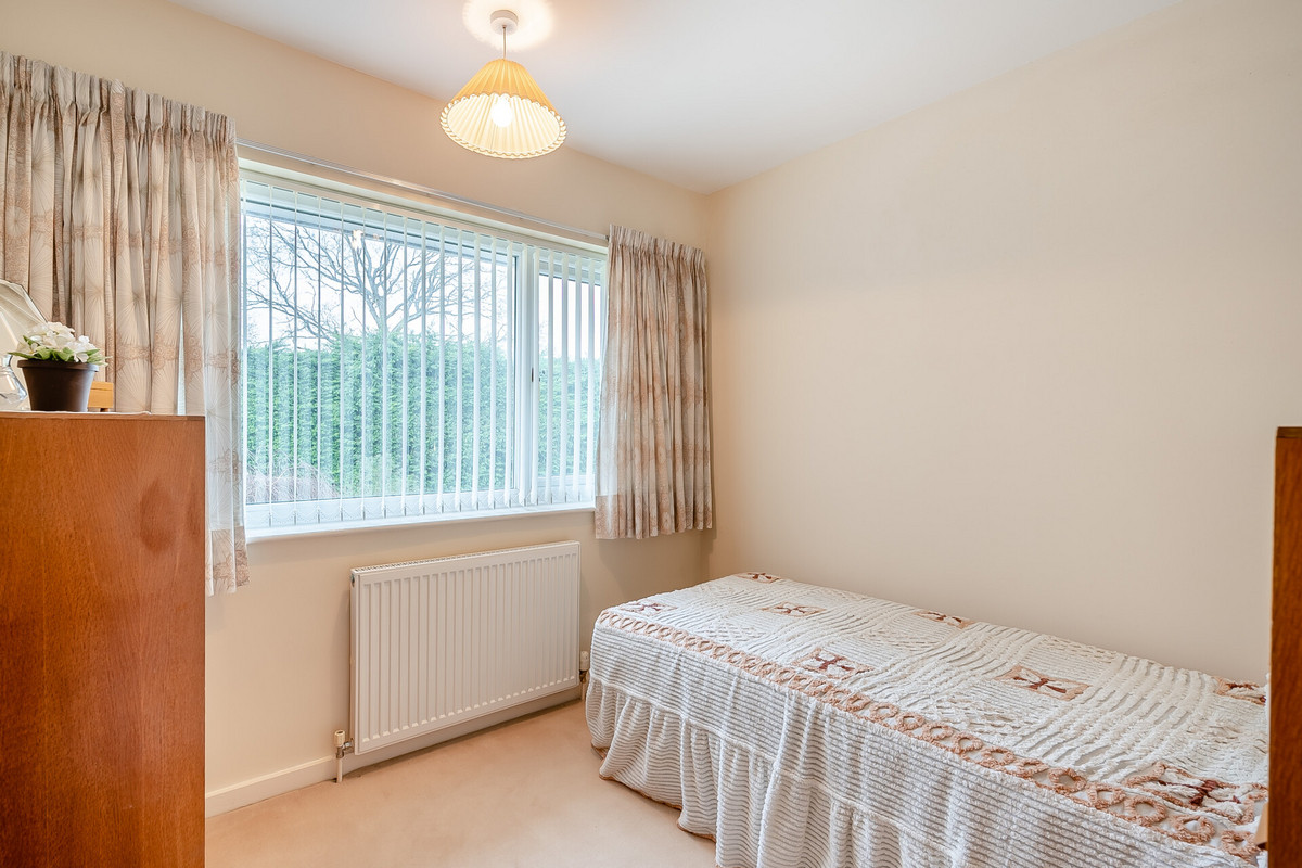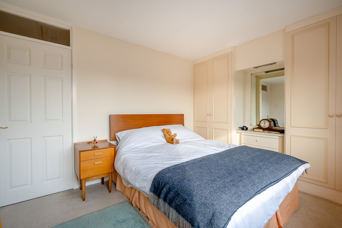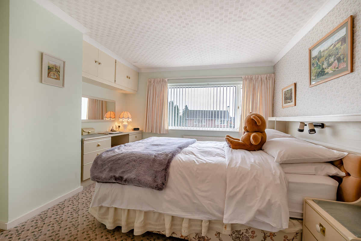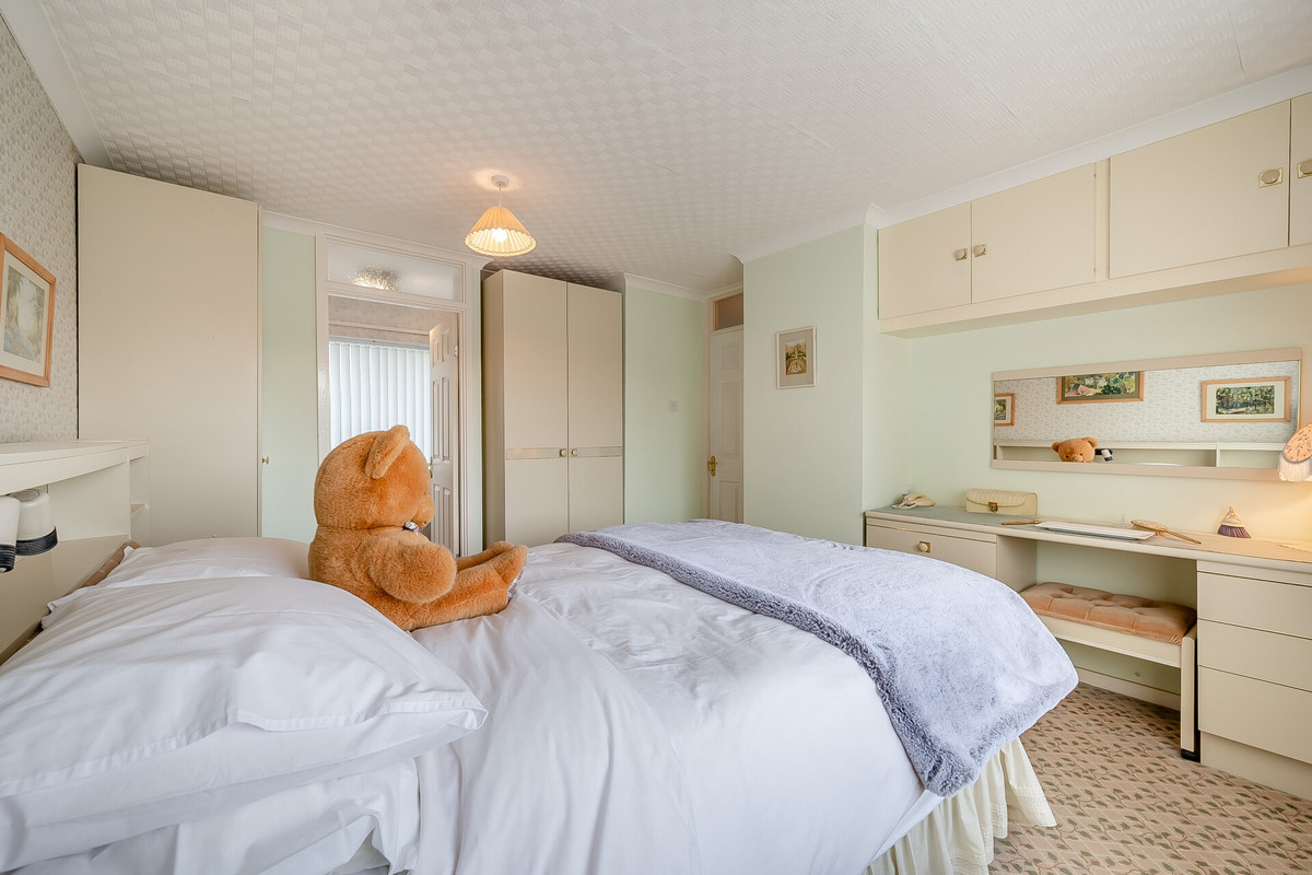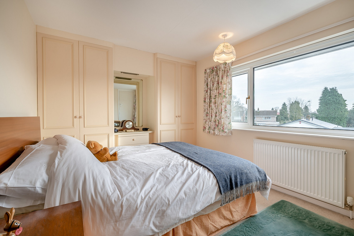 The second double bedroom, also overlooking the front of the property, features a large picture window and excellent built-in wardrobes and storage. The third, smaller double bedroom enjoys private rear garden views.