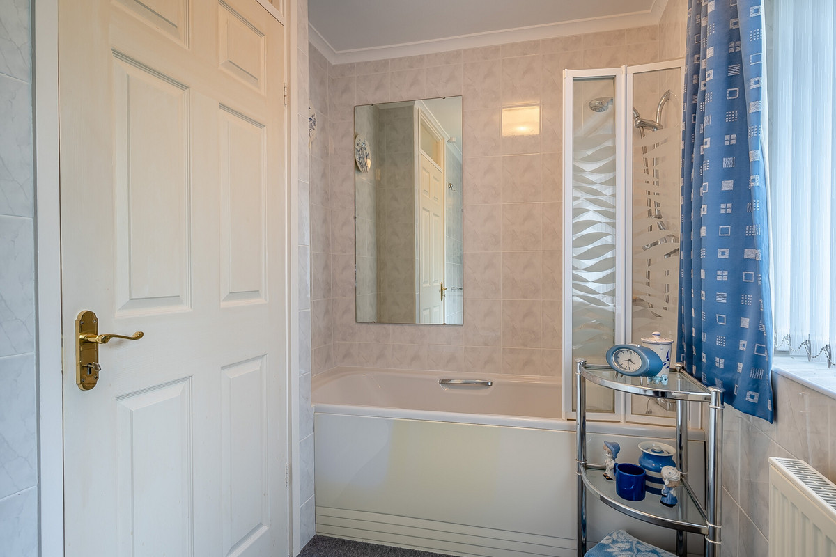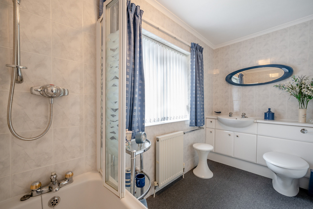 Upstairs, all three bedrooms are light and airy, with two offering excellent built-in storage. The principal bedroom overlooks the peaceful cul-de-sac and features a built-in vanity unit, wardrobes, and cabinets. It also benefits from a private en-suite, complete with a white suite comprising a WC, bidet, vanity hand basin, a separate shower cubicle with an electric Mira shower, and a mirrored double storage cabinet.