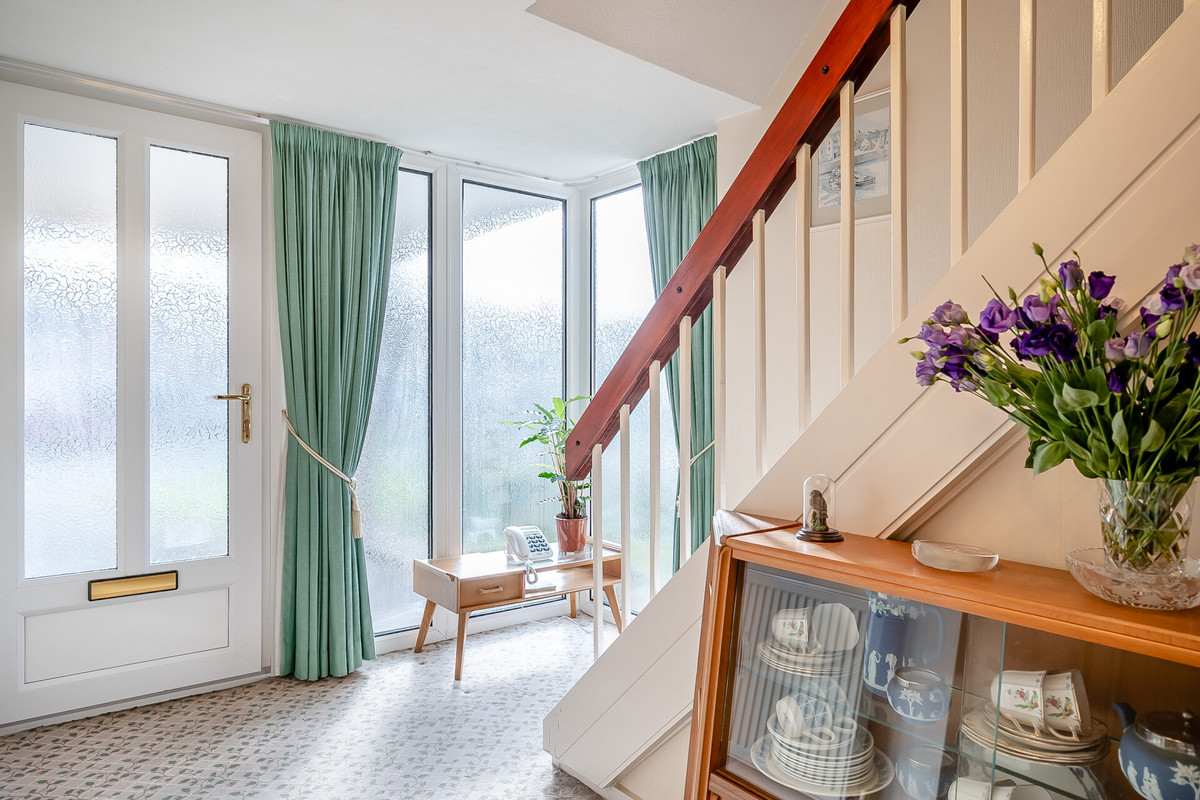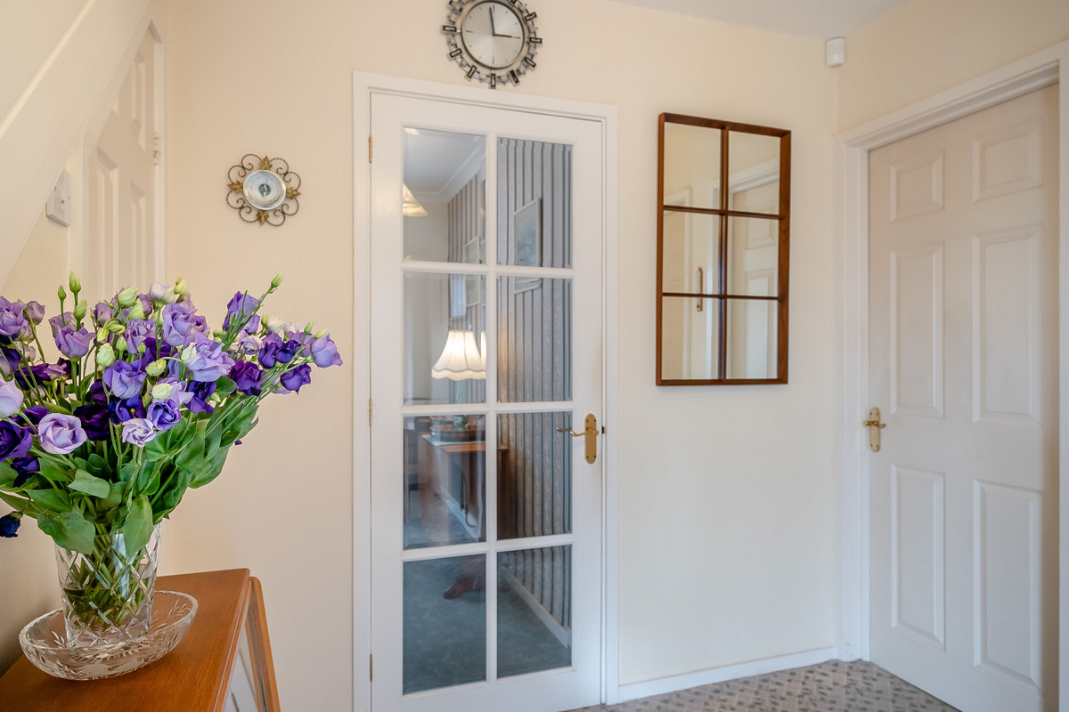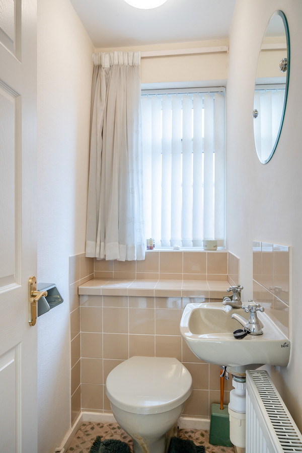 A private front driveway and neatly maintained front garden lead to a covered entrance, opening into a bright and airy reception hall. Large floor-to-ceiling windows flood this space with natural light, creating a welcoming atmosphere. The hall provides access to a smartly presented guest WC and a useful under-stairs storage cupboard.