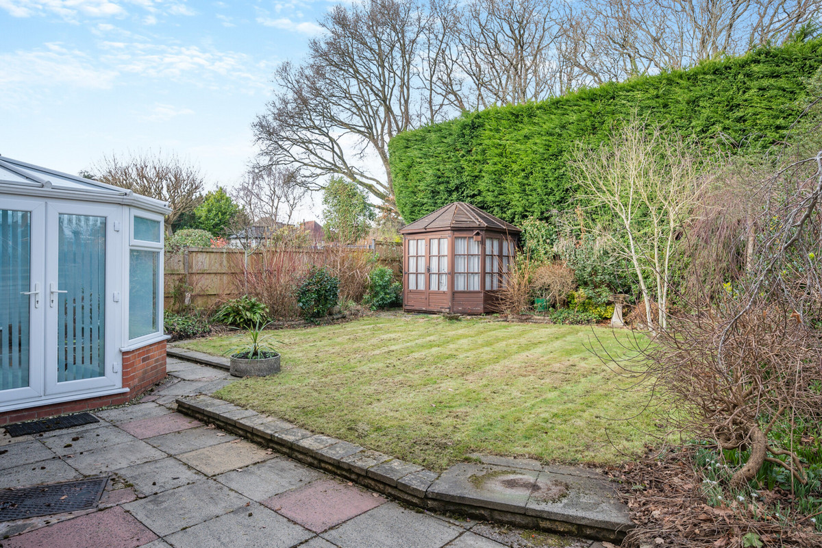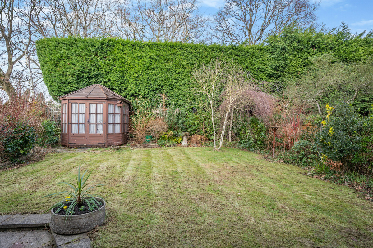 A wooden summerhouse sits towards the rear, adding to the garden’s charm and providing an additional space to relax and unwind outdoors.