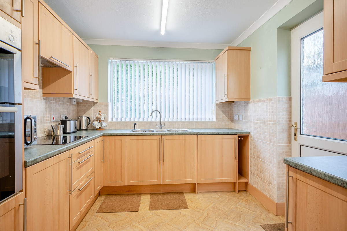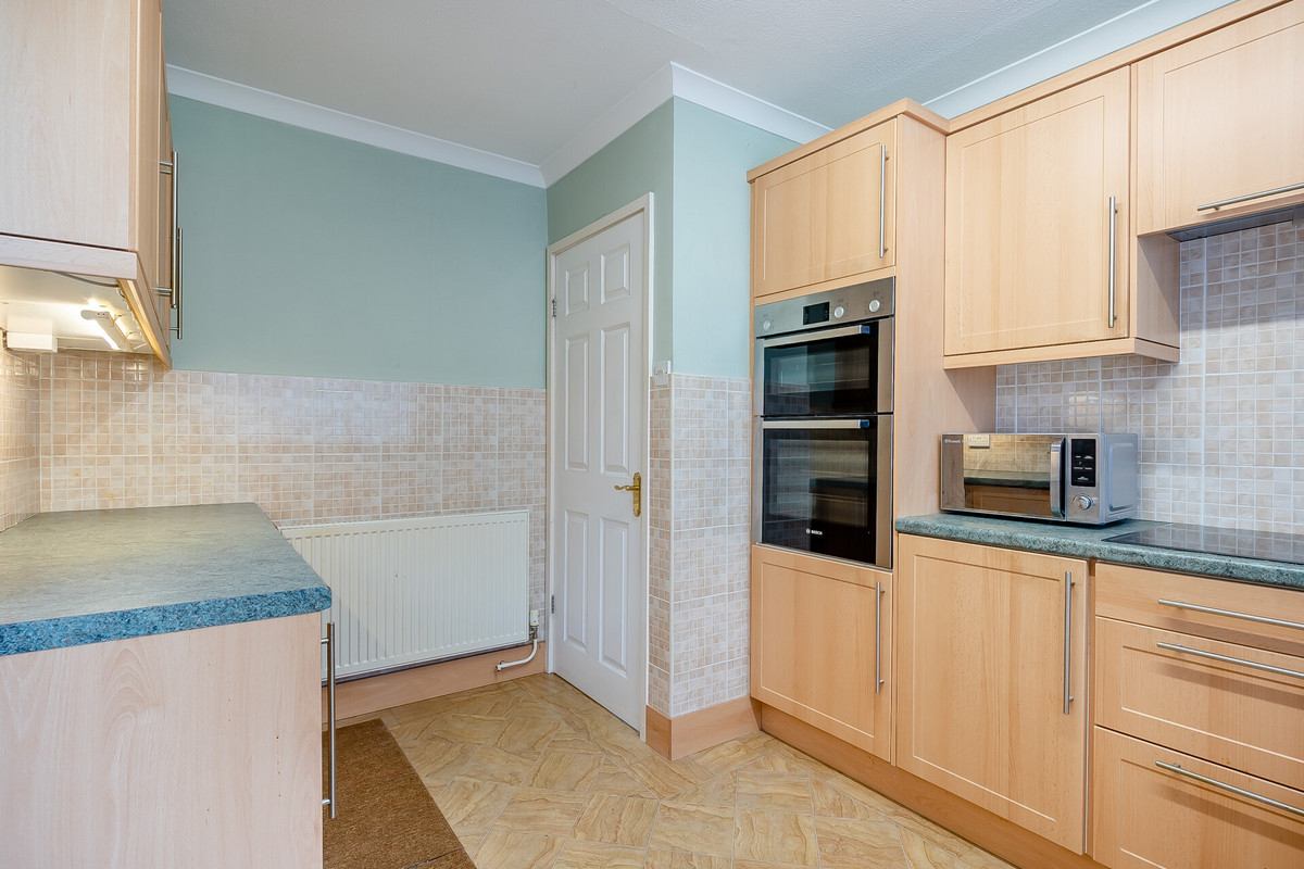The modern fitted kitchen is smartly presented with light ash-effect wall and floor-mounted cabinets, contrasted by stylish countertops and a matching backsplash. It offers an excellent range of integrated appliances, including a Bosch double electric oven and grill, an under-counter Candy fridge and Beko freezer, an AEG Electrolux ceramic hob, and a Hoover washing machine. The kitchen has a back door providing access to the rear garden, a side door into the garage, and a side passage leading to the front driveway through a gate.