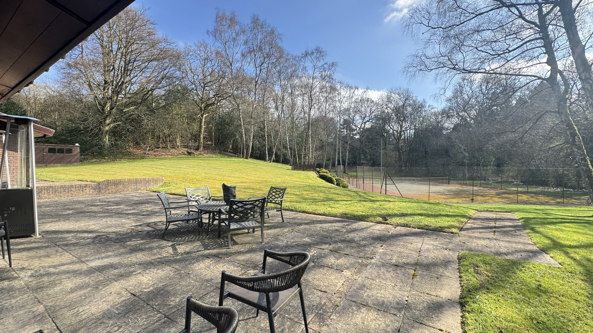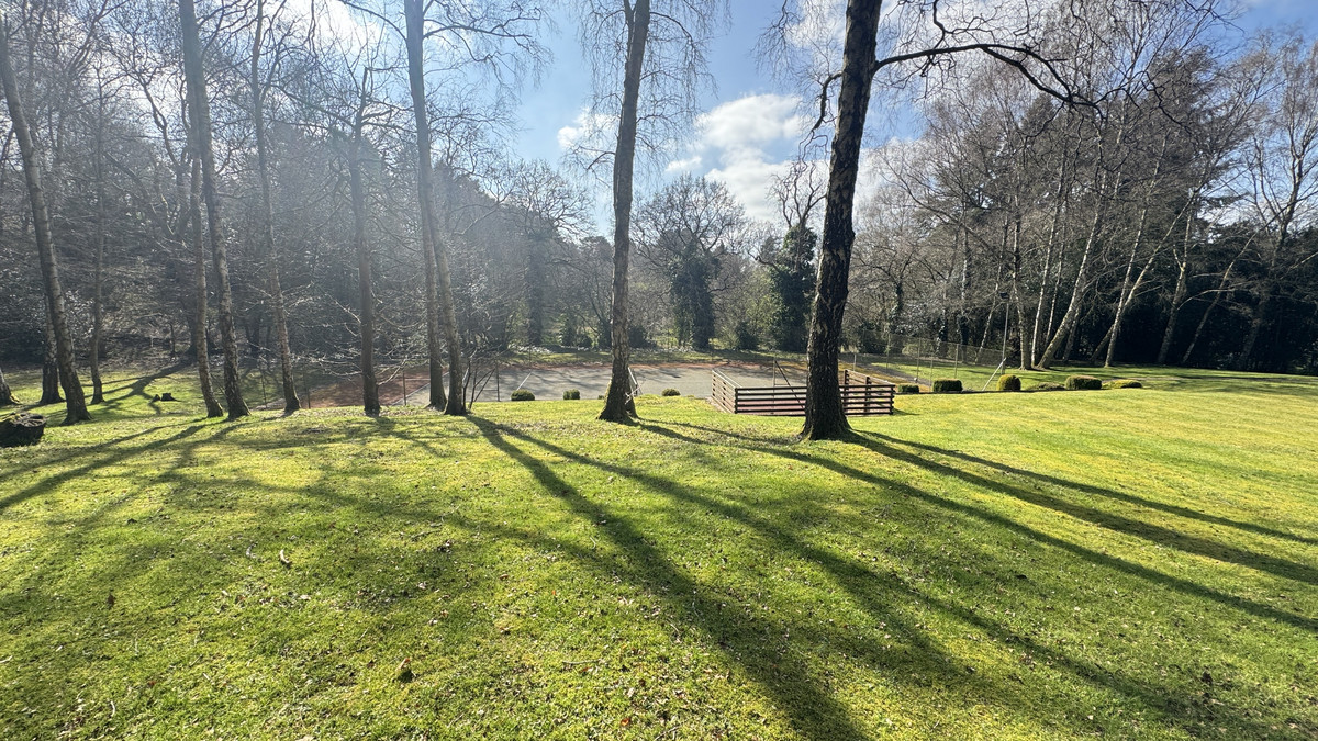 Set within approximately 2.5 acres, this exceptional residence offers privacy, space, and versatility and also the potential for redevelopment. The home includes a detached four-car garage, a tennis court with lifetime planning permission in place for conversion to a private leisure complex, and beautifully appointed interiors. Living spaces include a welcoming entrance hallway, kitchen, utility, lounge, study, cloakroom, dining room, and piano room. Originally five bedrooms, the layout has been reconfigured to three generous bedrooms with two adjoining dressing rooms and four bathrooms, three of which are en suite.