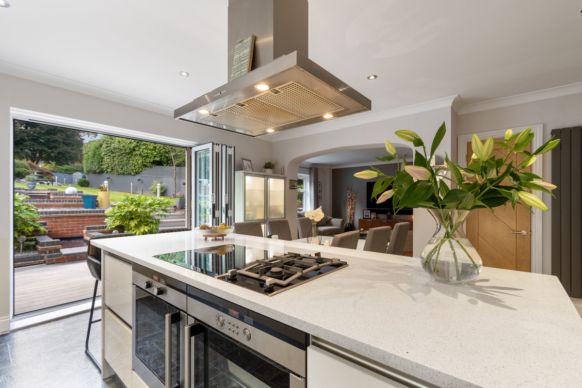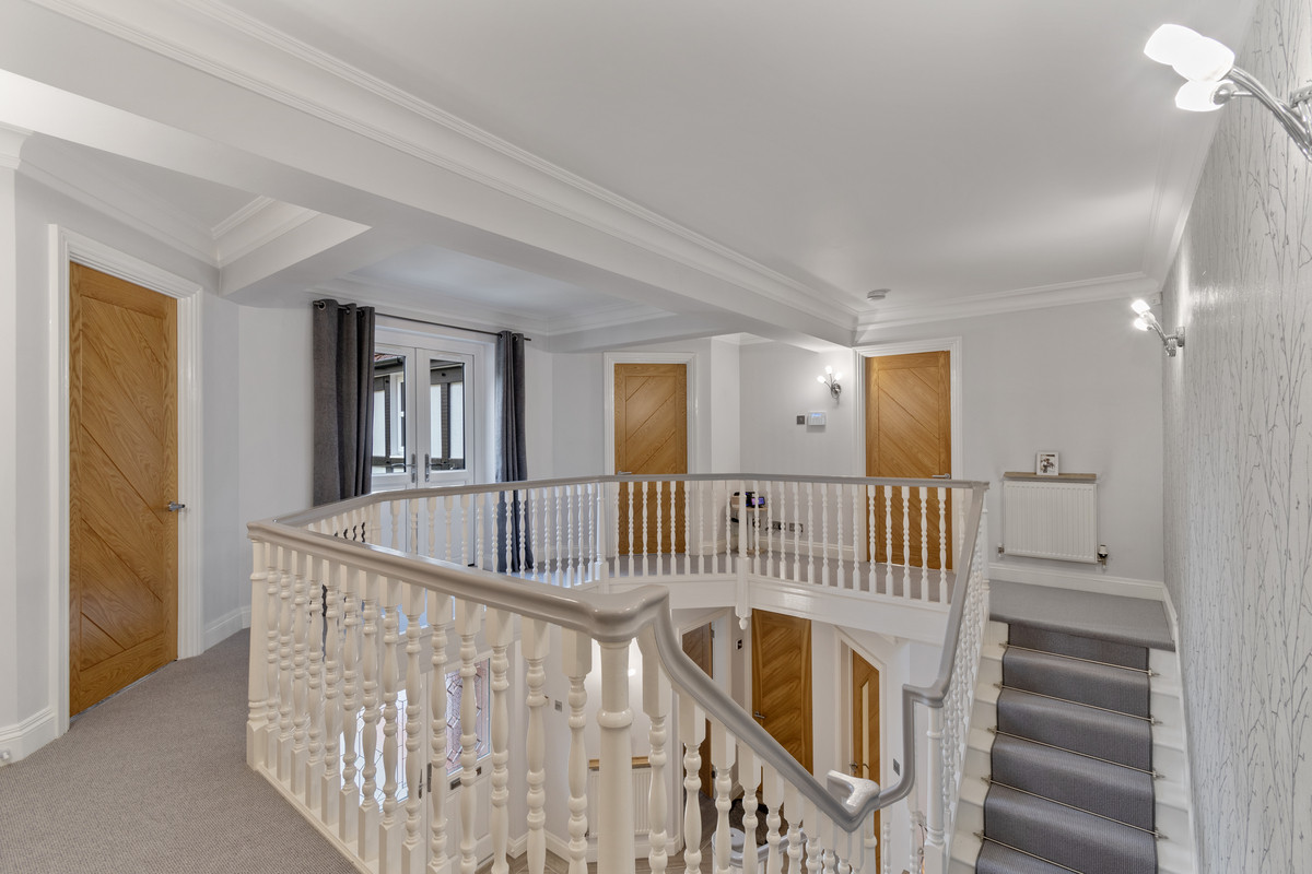 The property is a very well-balanced property, with spacious accommodation both upstairs and downstairs, detached double garage and a spectacular landscaped plot. Entering the property, one is greeted by the most grand entrance hallway with galleried landing, 5 bedrooms, two with ensuite and a further family bathroom. A feature balcony to the front of the property overlooks the external splendour of the surrounding area. The downstairs entrance hall leads to all further accommodation, to include spacious dining room, large family kitchen which opens up into the family room, spacious lounge with built in feature fire and TV, and large bifold doors to rear gardens, a good size study to the front, downstairs guest WC and access to the leisure facilities.