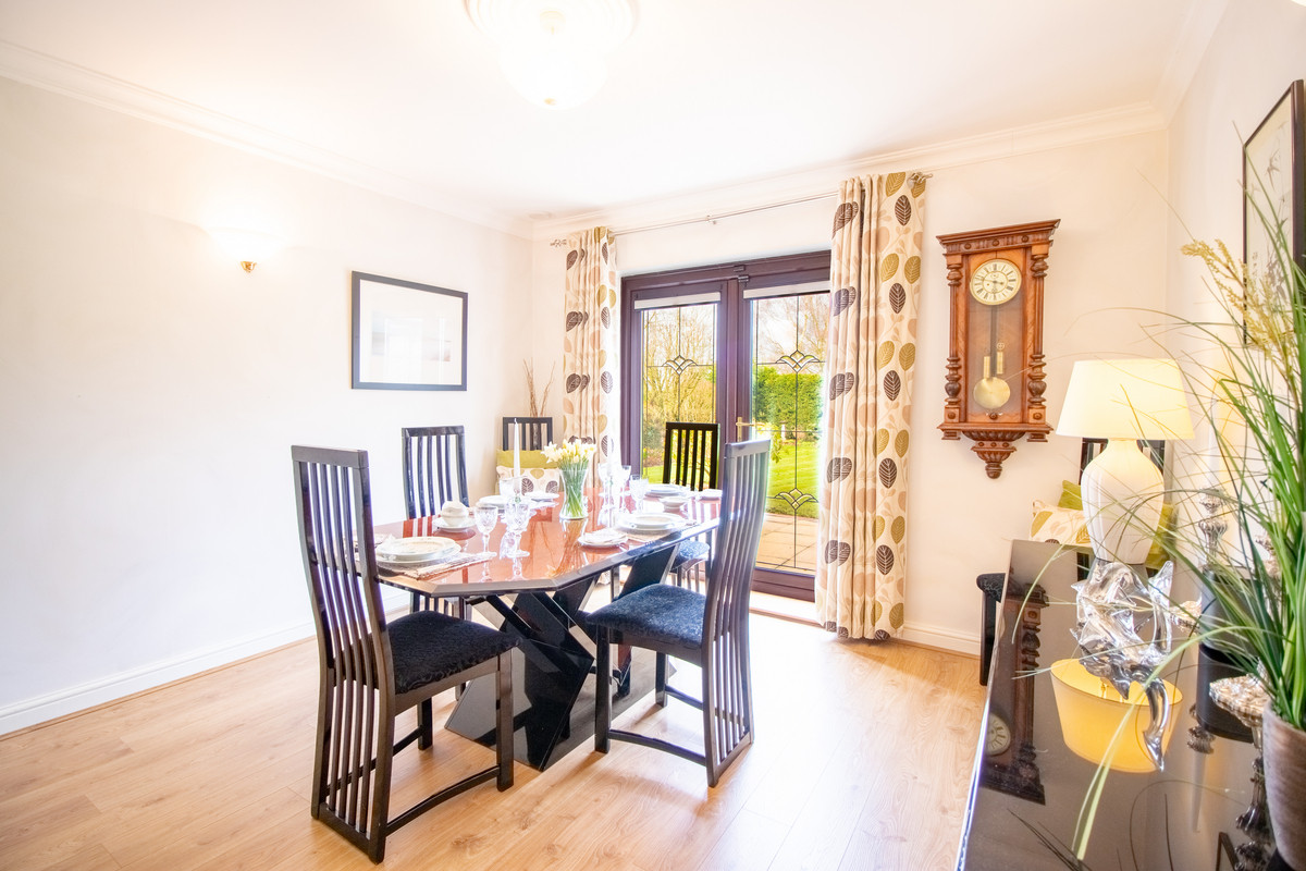 Conveniently located next to the kitchen is a good sized separate dining room, with laminate oak flooring and French doors leading directly to rear terrace and garden beyond. It has ample space for a large family dining table, perfect for all those special occasions.