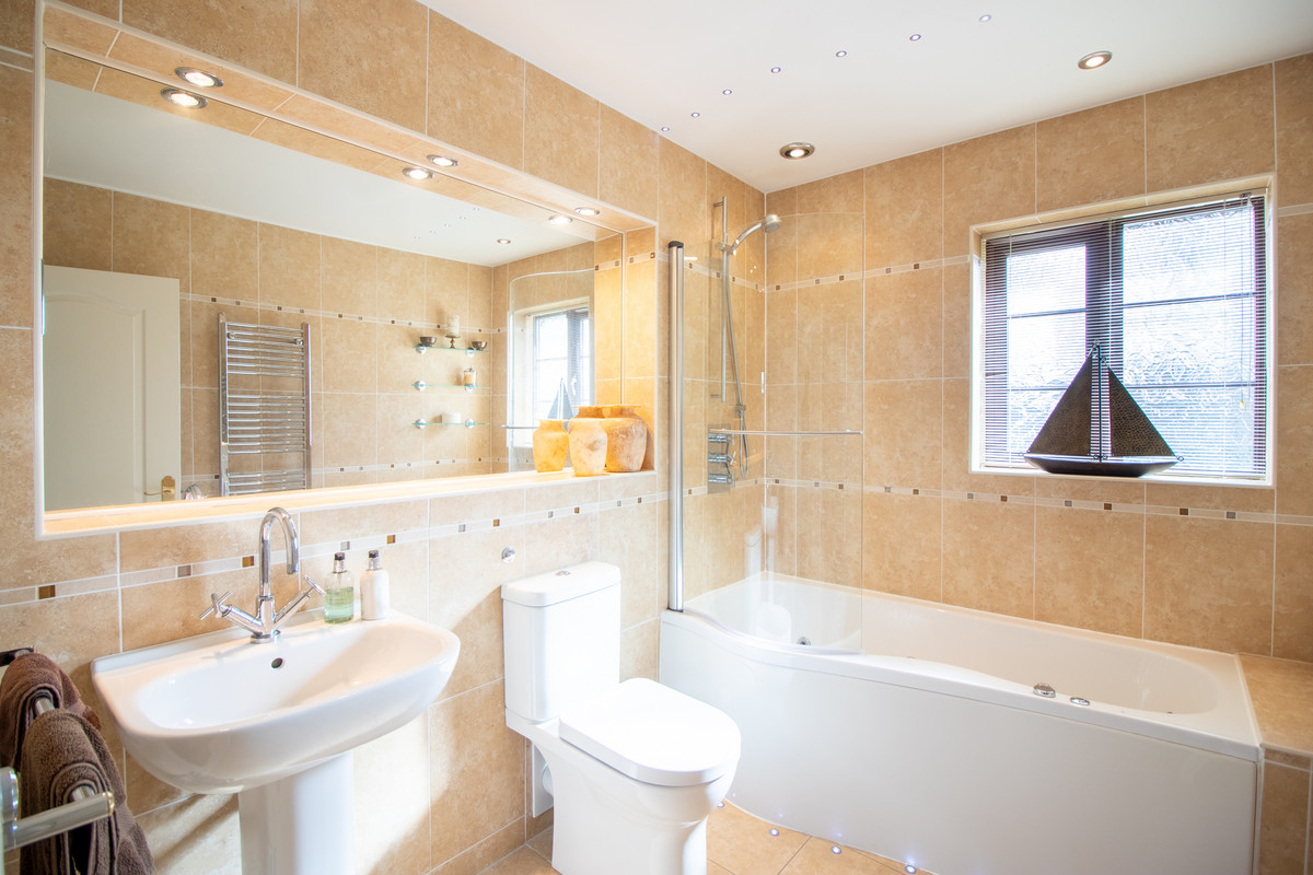 The second of the double bedroom suites overlooks the generous property frontage, enjoying views across the expanse of lawned front gardens and the village beyond. Again, with exquisite décor and immaculate presentation, this sizable double bedroom also offers built in wardrobes and has a smart ensuite bathroom with white ceramic tiling to the walls and floor and offering a corner shower and vanity unit with an inset hand basin, WC, inset mirror, and storage. The third double bedroom is also to the front of the property and has an attractive inset window, chic décor, including a lovely feature wall, and large double sliding wardrobes with a featured mirrored door. Bedrooms four and five, both doubles, have delightful rear views, one is currently used as a pretty guest bedroom and the other is presently a playroom for the grandchildren. The spacious family bathroom is well presented with a modern suite including a spa shower/bath with a glass screen, pedestal hand basin and WC, and a chrome heated towel rail and large inset mirror. Finally, there is a useful airing cupboard that offers ample storage space in addition to the hot water tank and a generous loft with a light and ladder.