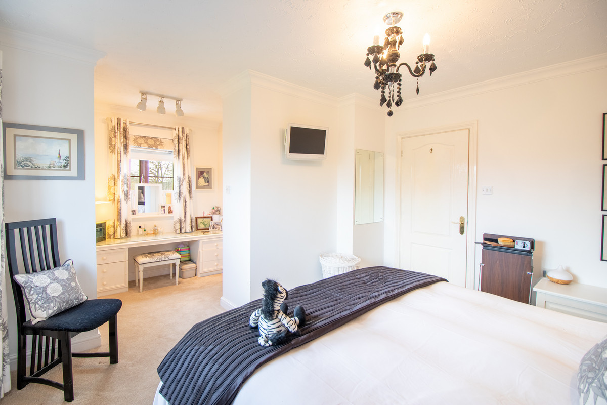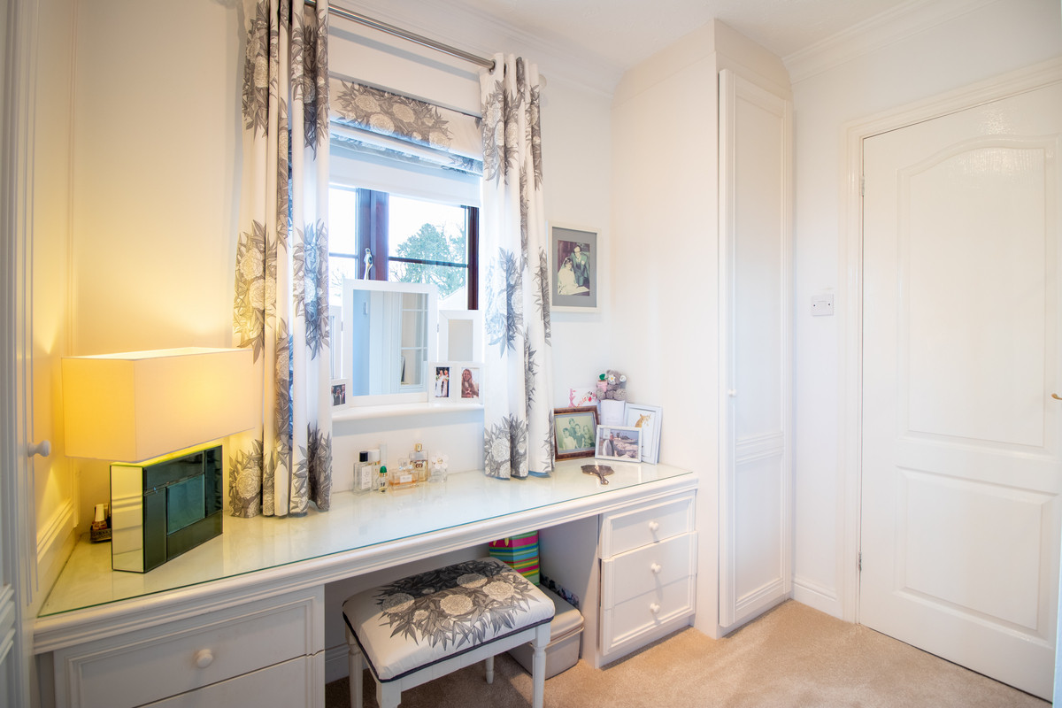 This family home offers an equally spacious feel to its first floor layout, with the light and airy landing leading off to five double bedrooms and three bathrooms, including two suites. The principal bedroom suite enjoys simply stunning views of the rear garden, meadow, and open countryside beyond, and is beautifully presented with a feature wall, crisp white décor, and plush neutral carpet. It has a superb dressing area with a built-in vanity unit and excellent built in wardrobes and storage. Leading from here is the luxury principal en-suite bathroom, with its double walk-in shower having a large glass screen, charcoal grey splash back and with a rain head and handheld shower unit. This lovely contemporary bathroom also offers a smart white vanity suite housing both the hand basin and lowlevel WC, together with ample storage, smart countertops, and mirrored storage above. There is also a large chrome towel rail.