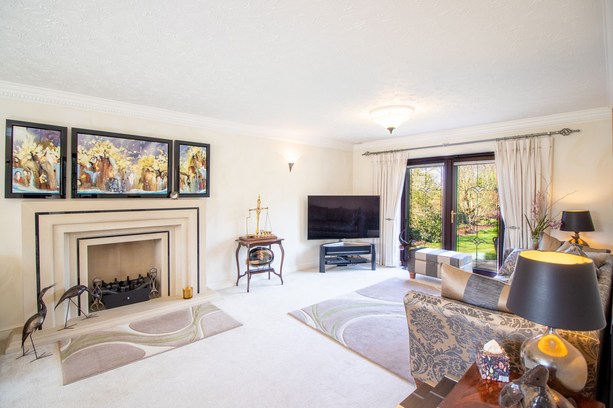 The living room is exceptionally spacious and enjoys dual aspect views from a large picture window overlooking the private frontage and double French doors allowing direct access to the stunning rear gardens and beyond. The feature Portuguese limestone fireplace creates a real focal point to this delightful reception room that offers ample space to entertain family and friends. Across the reception hall to the front of the property is the well-proportioned and superbly fitted home study. Having laminate oak flooring and an excellent range of Neville Johnston oak office furniture, it creates the perfect place to work from home with ease, offering a peaceful space away from the busier household areas and with a lovely private outlook to the front garden and drive.