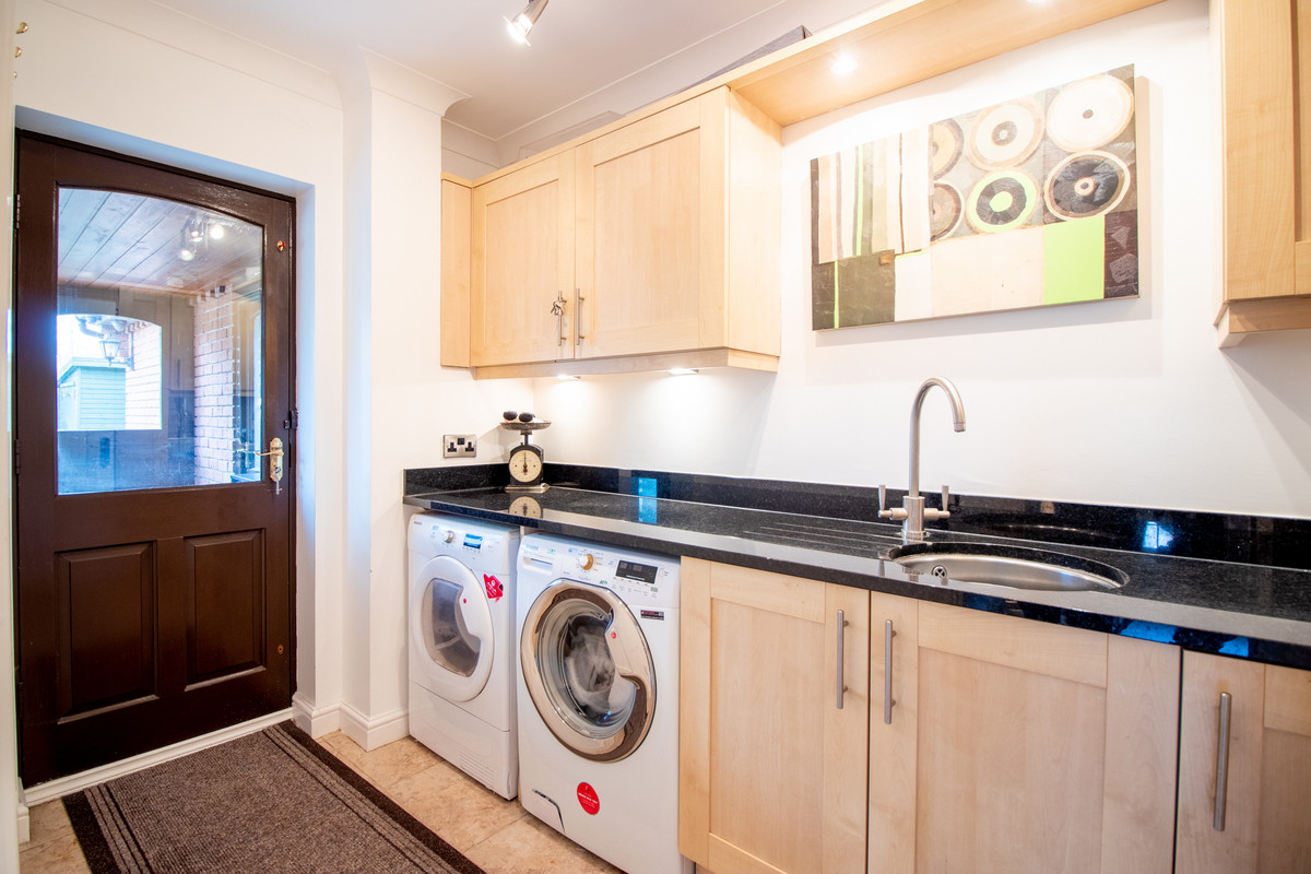 Also leading off the kitchen is the well-proportioned laundry room, that follows the same high quality kitchen design with granite countertops and upstands and an array of wall, floor, and tall kitchen cabinets, offering superb further storage space. There is a round inset Franke laundry sink with mixer tap and space for a second fridge-freezer, washing machine and tumble dryer. A door leads from here into the very useful boot room giving access into both the garden and integrated garage from here and a real must for any busy family home, creating the perfect buffer between home and garden.