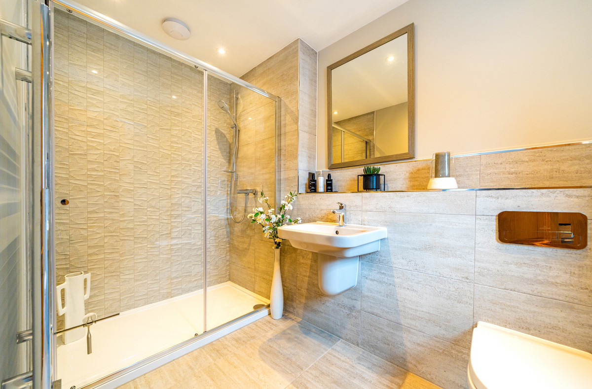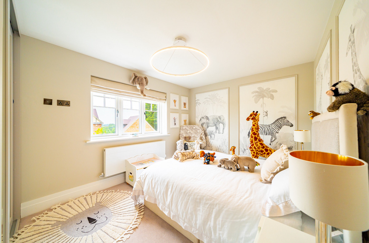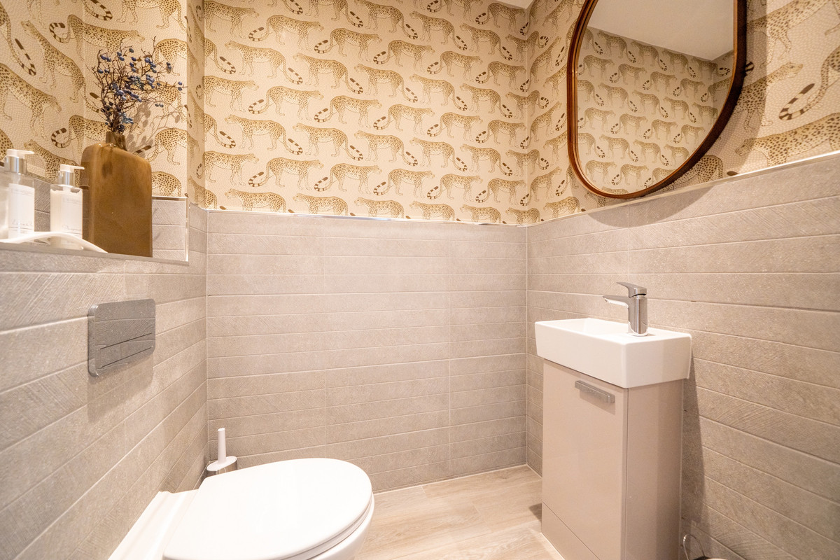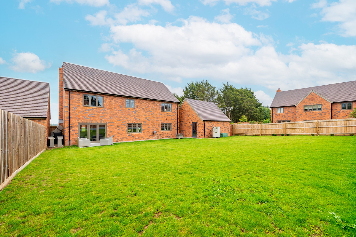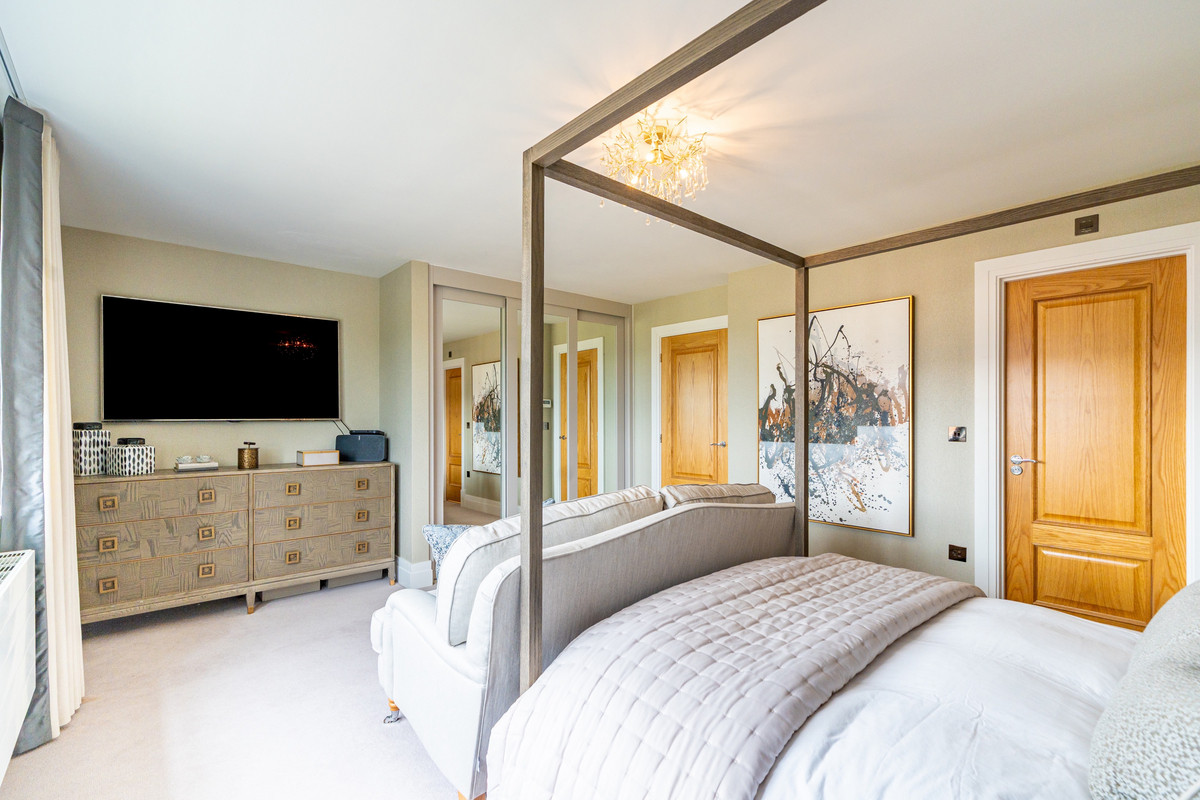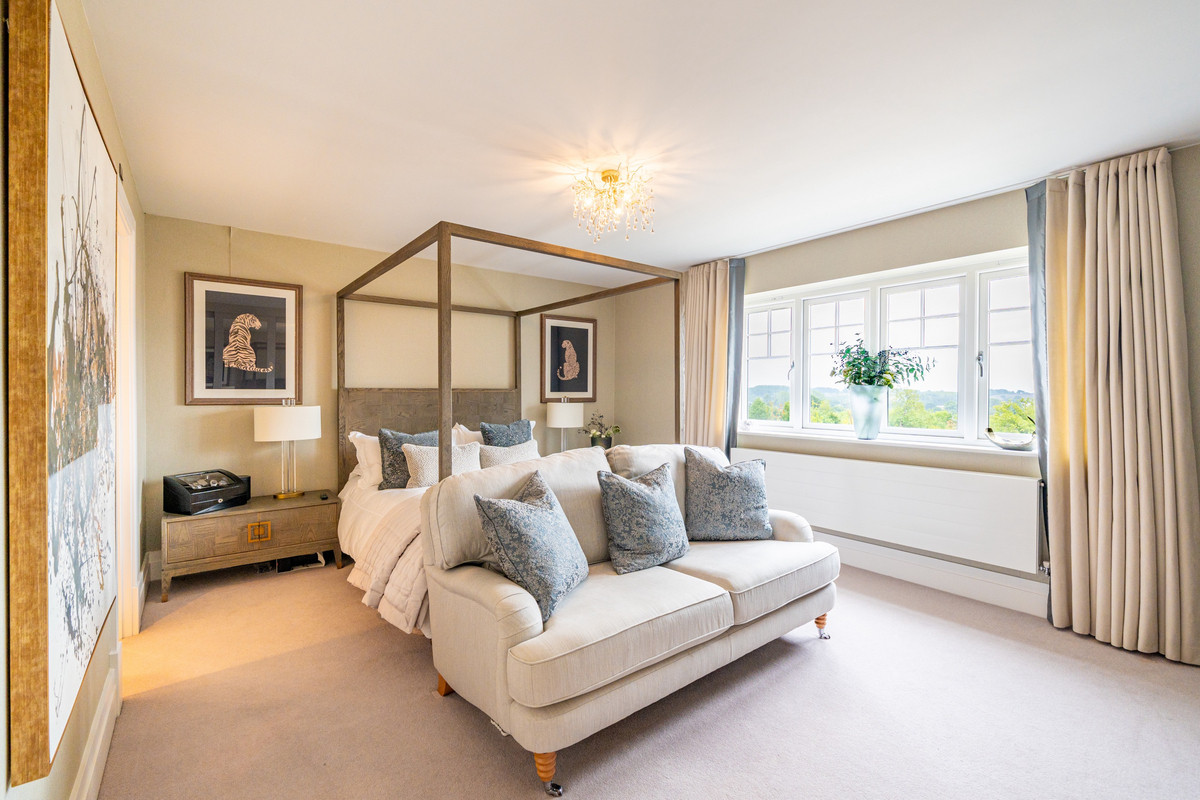Upstairs, the main bedroom enjoys far-reaching countryside views, bespoke fitted wardrobes, and a beautifully appointed en suite. The second bedroom also benefits from its own en suite and fitted wardrobes, while bedrooms three and four are generous doubles that share a sleek and contemporary family bathroom. The fifth bedroom adds further flexibility and is currently used as a walk-in dressing room.