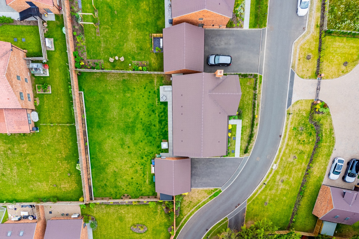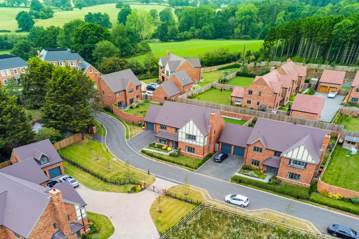 The architectural style is inspired by the region’s heritage, incorporating features such as half-timbered gables, tumbled brick façades, tall chimneys, and overhanging eaves. At the southern end of the development, two striking homes draw influence from the neo-Georgian era, built in red engineered brick with stone porticos, large sash windows, and steep slate roofs that suggest a quiet grandeur.
