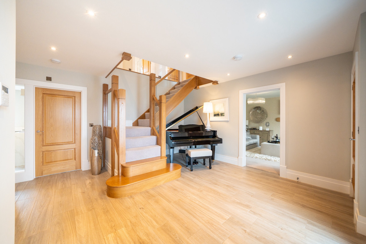 This elegant and expansive home offers exceptional family living, with a layout designed to balance comfort and flexibility. A generous central hallway creates an impressive first impression, featuring a striking solid oak staircase that rises to a gallery landing on the first floor.
