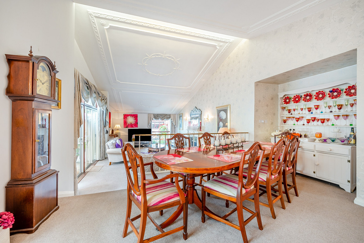 Back in the centre of the home, double mirrored glass panel doors lead into the impressive split-level dining and living room. This exceptionally spacious room, with its high-pitched ceiling and decorative plasterwork, creates the perfect space for family gatherings. The upper level is dedicated to the formal dining area, offering ample space for a large dining table and chairs. Two steps lead down to the spacious living room, featuring a fireplace, large windows overlooking the side courtyard, and double sliding doors leading to the main rear terrace, ideal for al fresco dining and creating a seamless flow from indoors to outdoors.