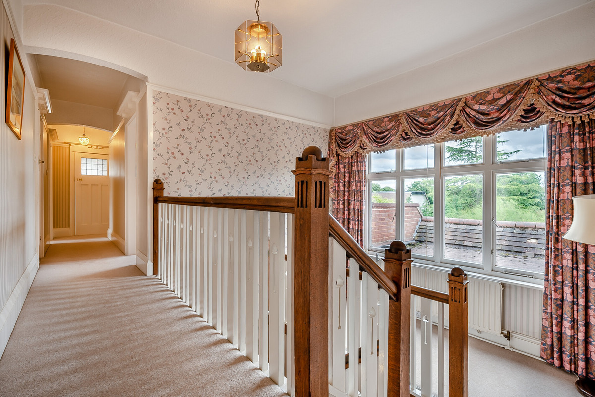 The magnificent solid oak dog-leg staircase, with lovely detailed balustrades, the large picture window overlooking the rear gardens, and the gallery landing create a superb area to sit and read. Once at the top of the stairs, the landing splits off to two sides and leads to five double bedrooms, two bathrooms, and access to a sizable loft space.