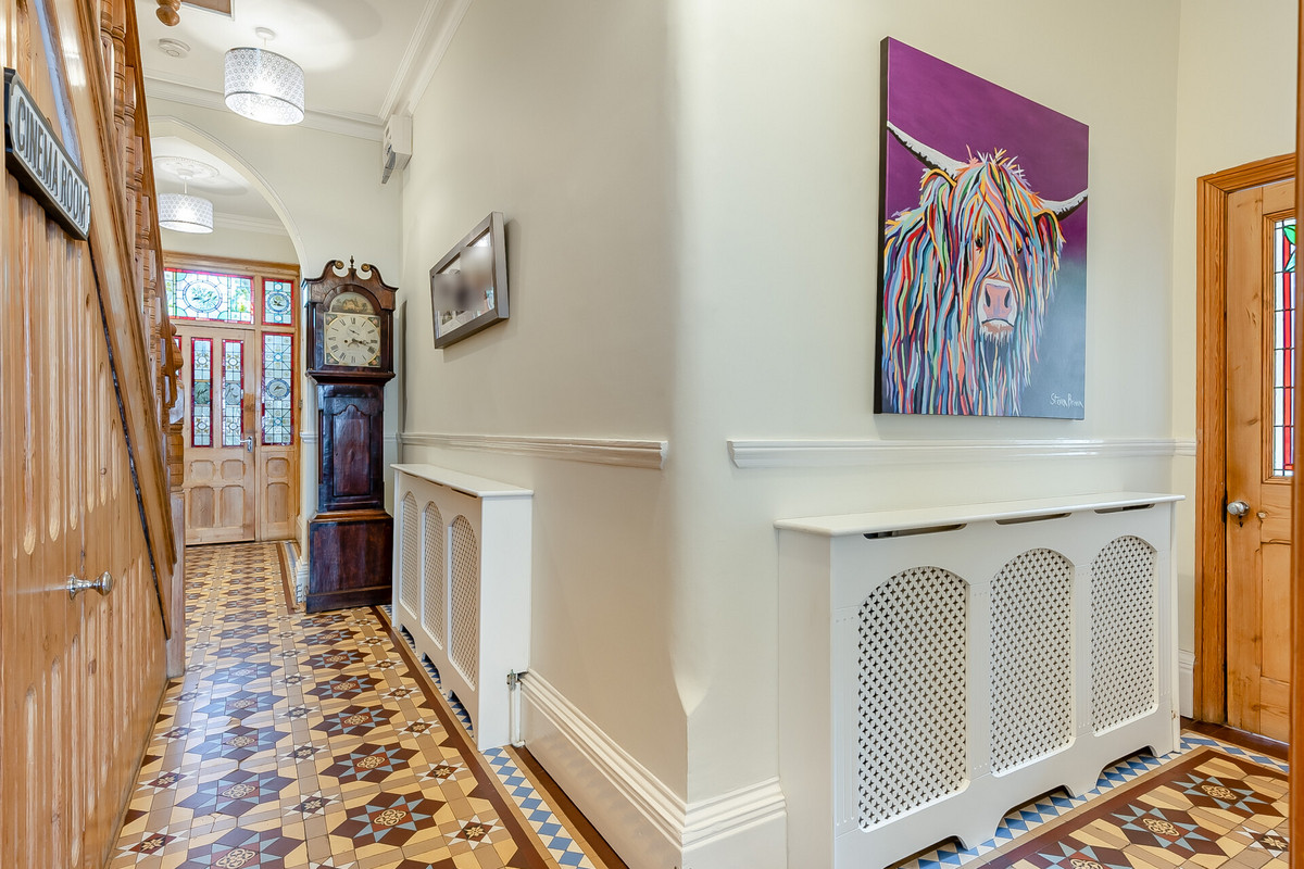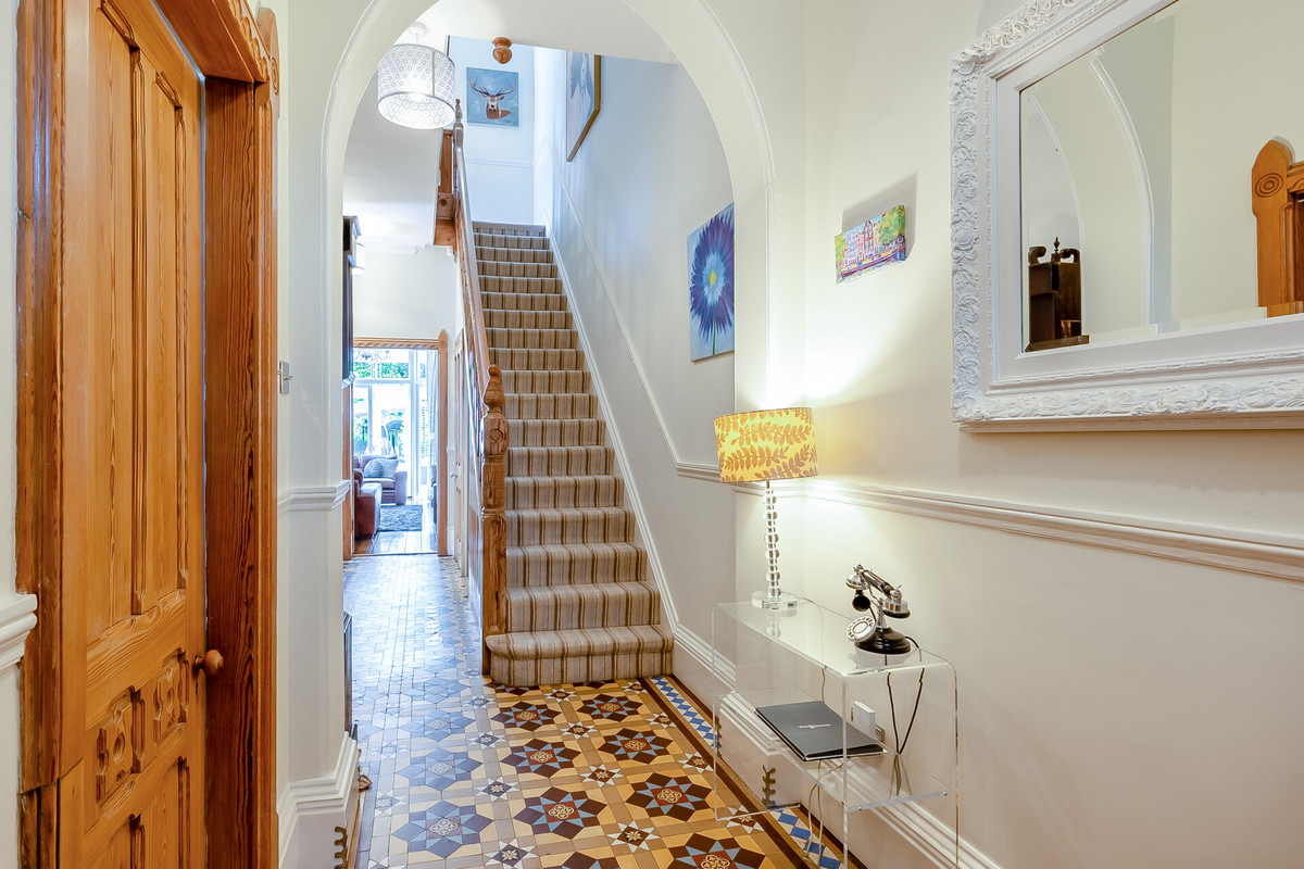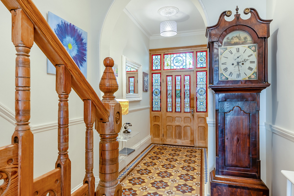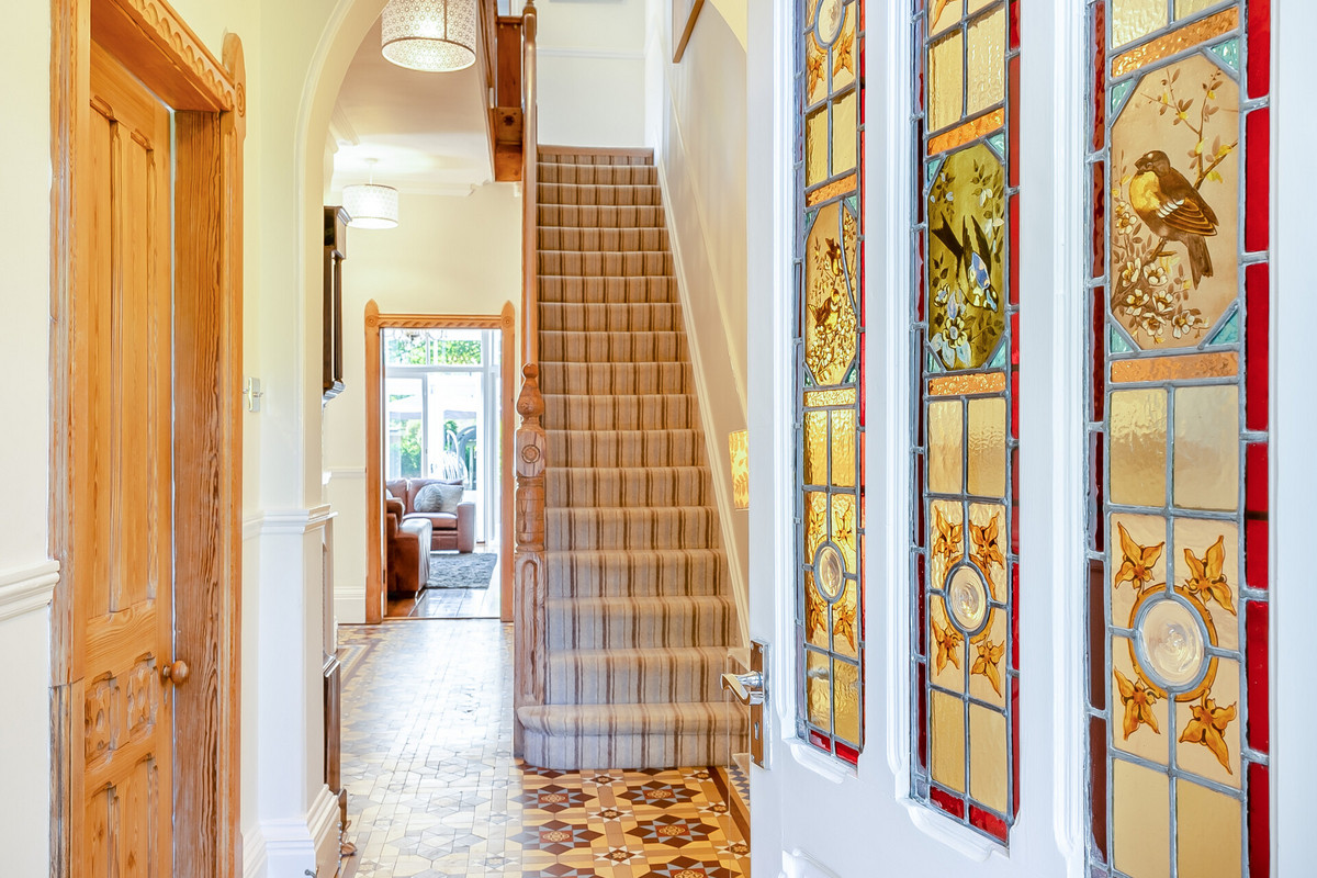 Approached via a wide gravel driveway bordered by mature lilacs and holly, this beautiful family home is set back from the road and enjoys a high degree of privacy. It also offers generous private parking. The original storm porch creates a charming entrance into Fairview and features a beautiful original Minton tiled floor that continues throughout the reception hall and inner hall, where stunning stained-glass panels frame the entrance to this family home.