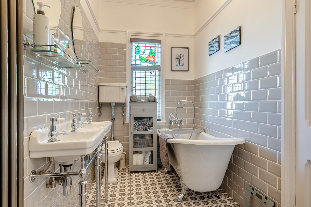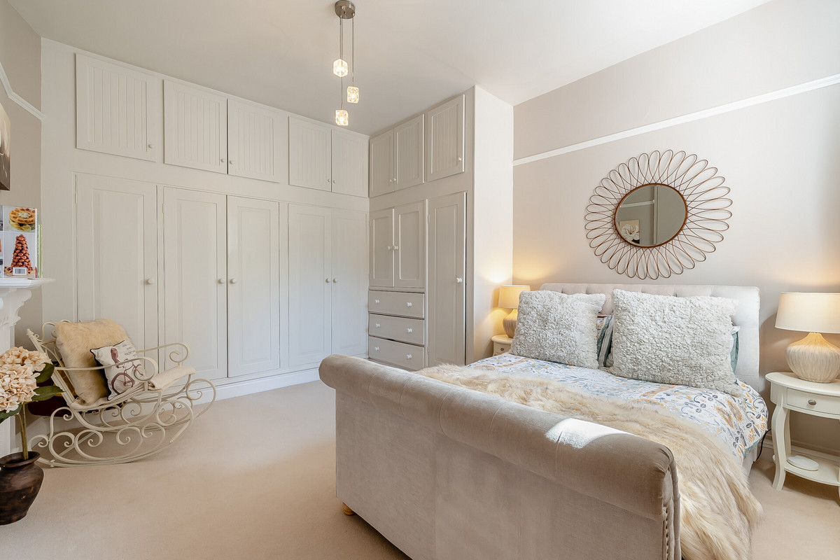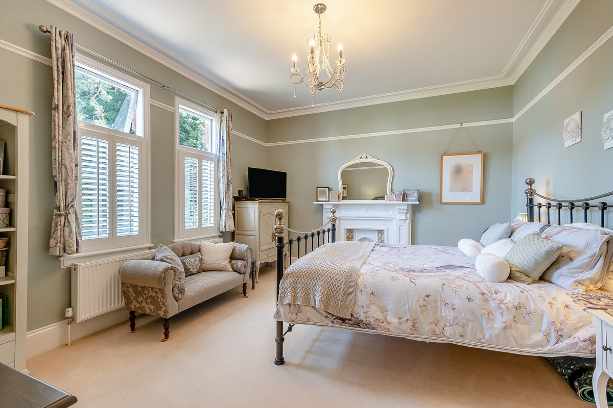 The principal bedroom suite is spacious and beautifully presented, featuring an original fireplace, immaculate plasterwork, and white plantation shutters on two front-facing windows—all complemented by soft Farrow & Ball tones. The luxurious en suite continues the palette, with a classic white suite comprising a claw-foot bathtub, twin pedestal basins, and a large walk-in shower, all finished with high-quality Burlington fittings.