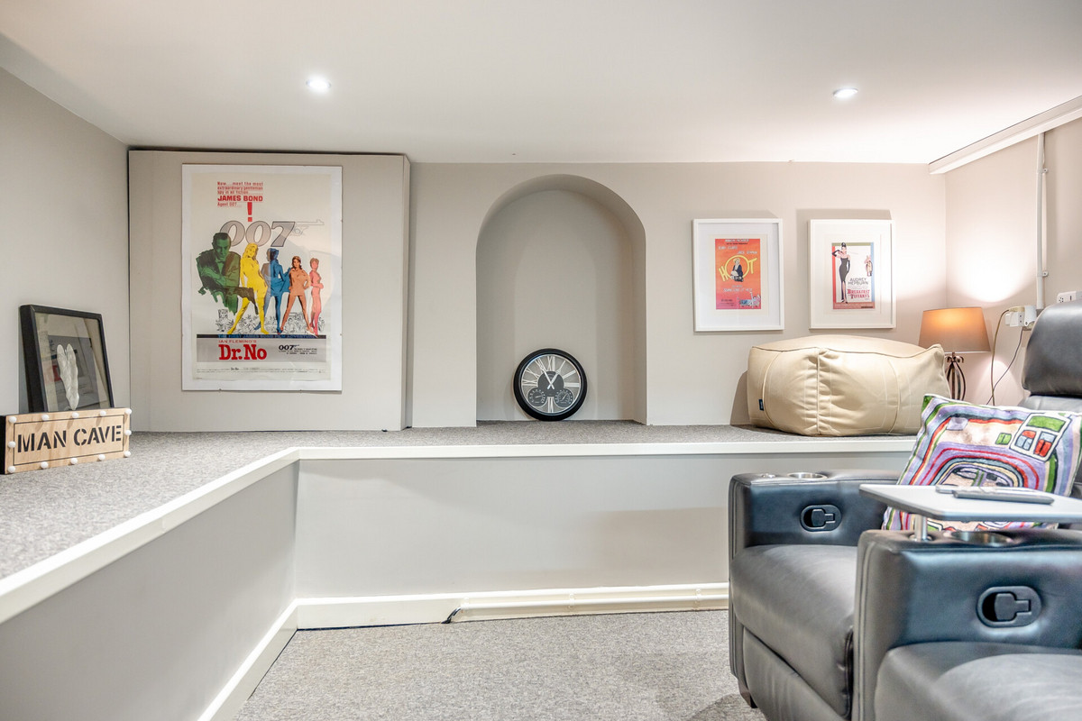 The original panelling along the staircase conceals both a useful cloakroom storage area and the door leading to the cellar. The cleverly converted basement, professionally tanked in 2019, now offers a fabulous cinema room with excellent head height, built-in shelving, and soft grey décor. Adjacent to this is a second cellar space, ideal for bespoke wine storage.