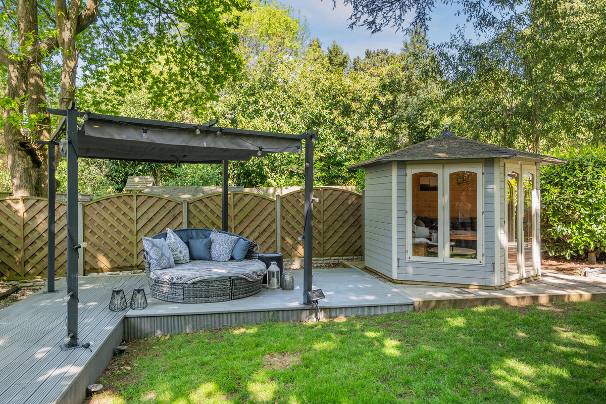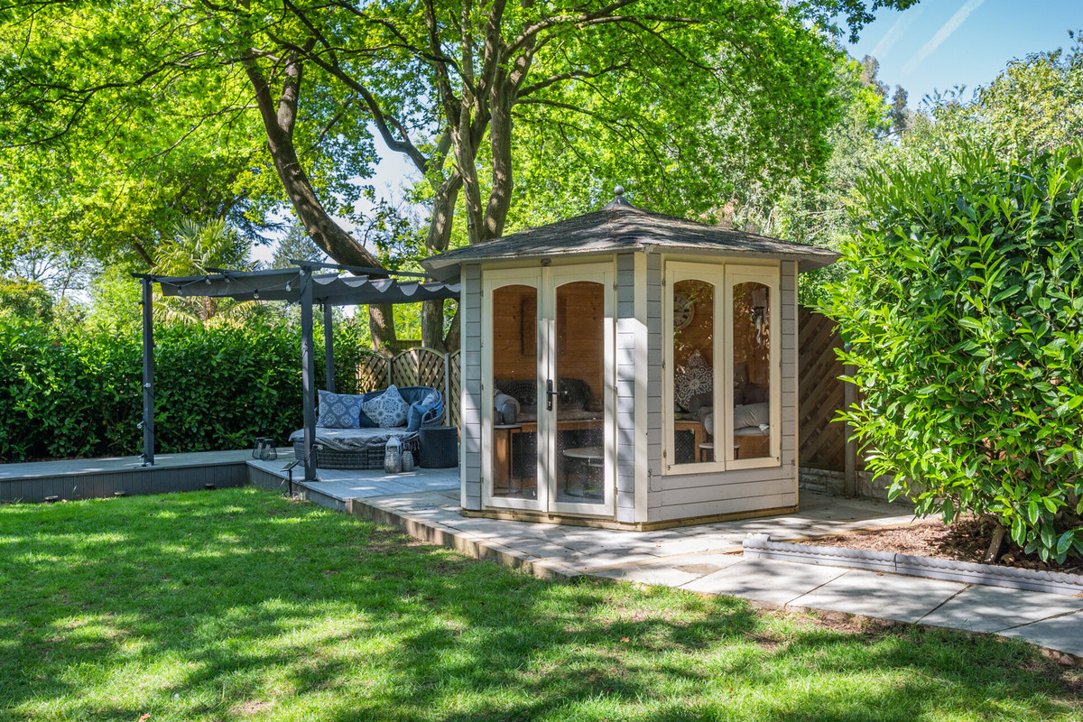 The garden is meticulously maintained and richly planted with mature trees and vibrant specimens, including peonies, acers, maples, camellias, an olive tree, apple tree, and rhododendrons. At the far end, a charming wooden summer house sits on a raised deck—a perfect place to relax and unwind in the evening sun.
