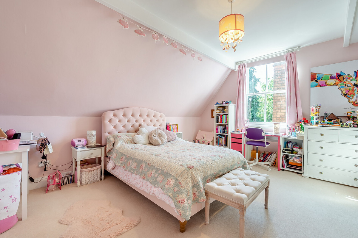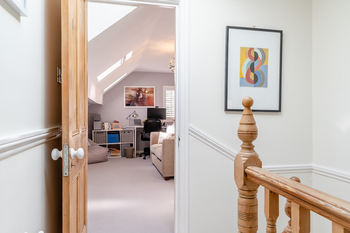 The top floor offers three further spacious double bedrooms, all beautifully presented. Bedrooms four and five feature charming original fireplaces—one with views over the rear garden, the other enjoying far-reaching front-facing views. The sixth bedroom benefits from two Velux windows and a rear window, all fitted with plantation shutters, making it ideal as a home office or an additional double bedroom.