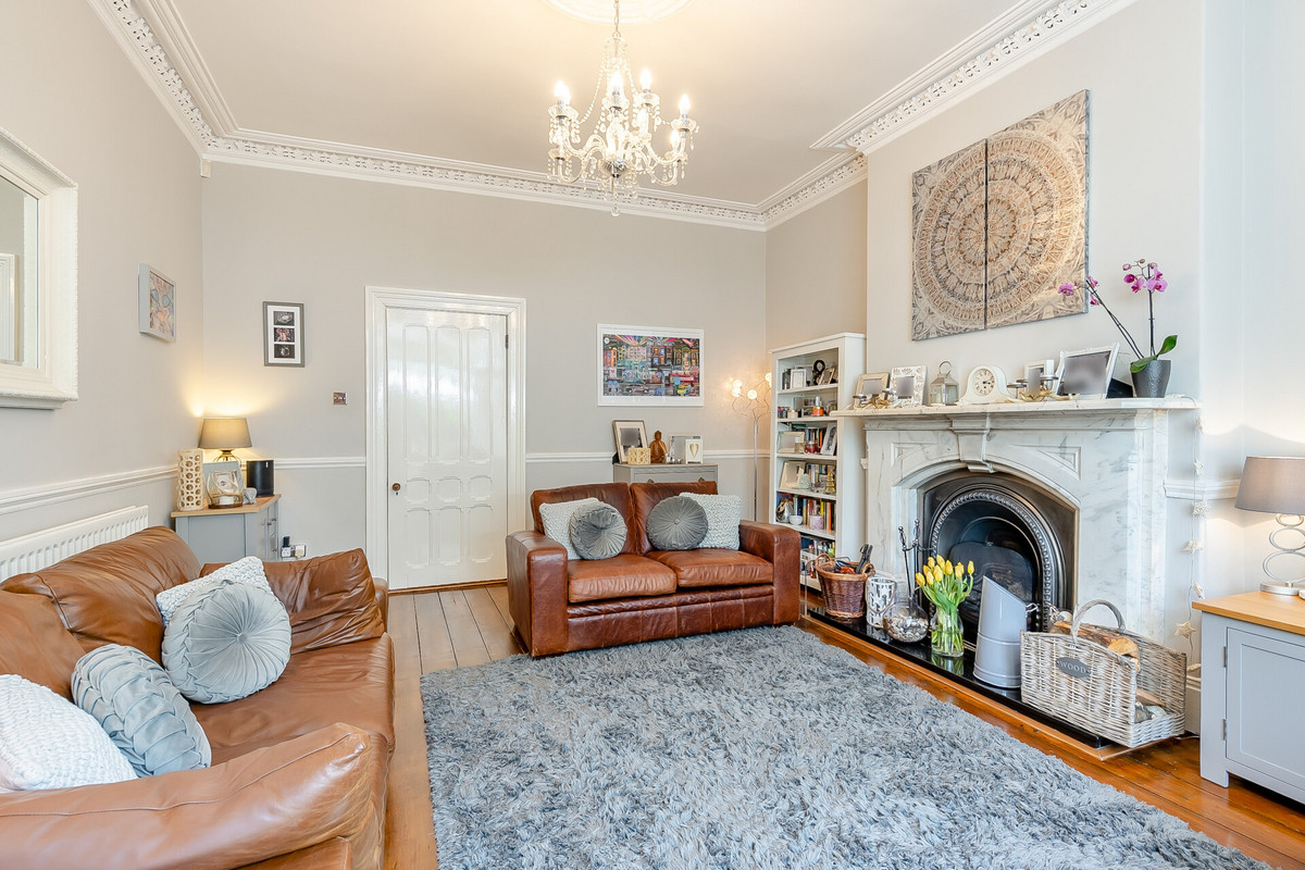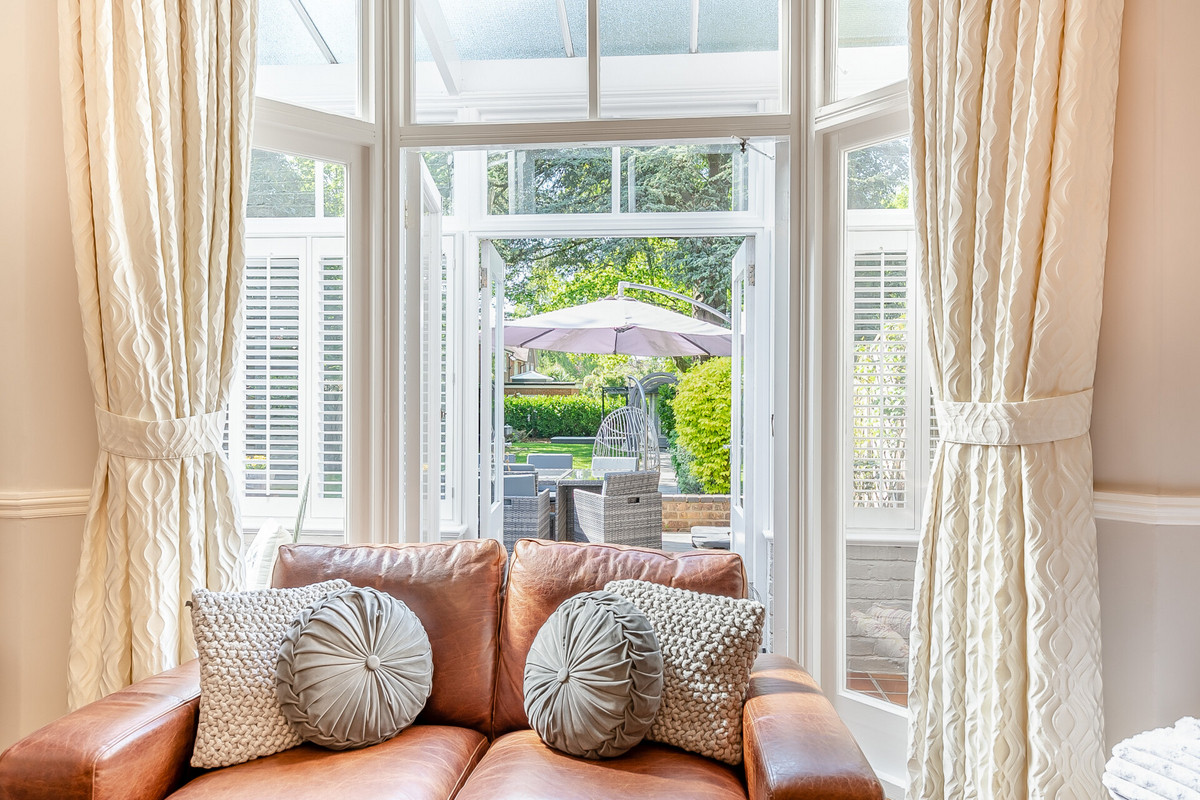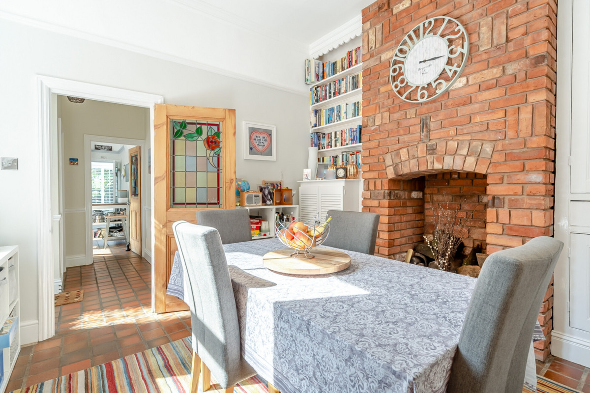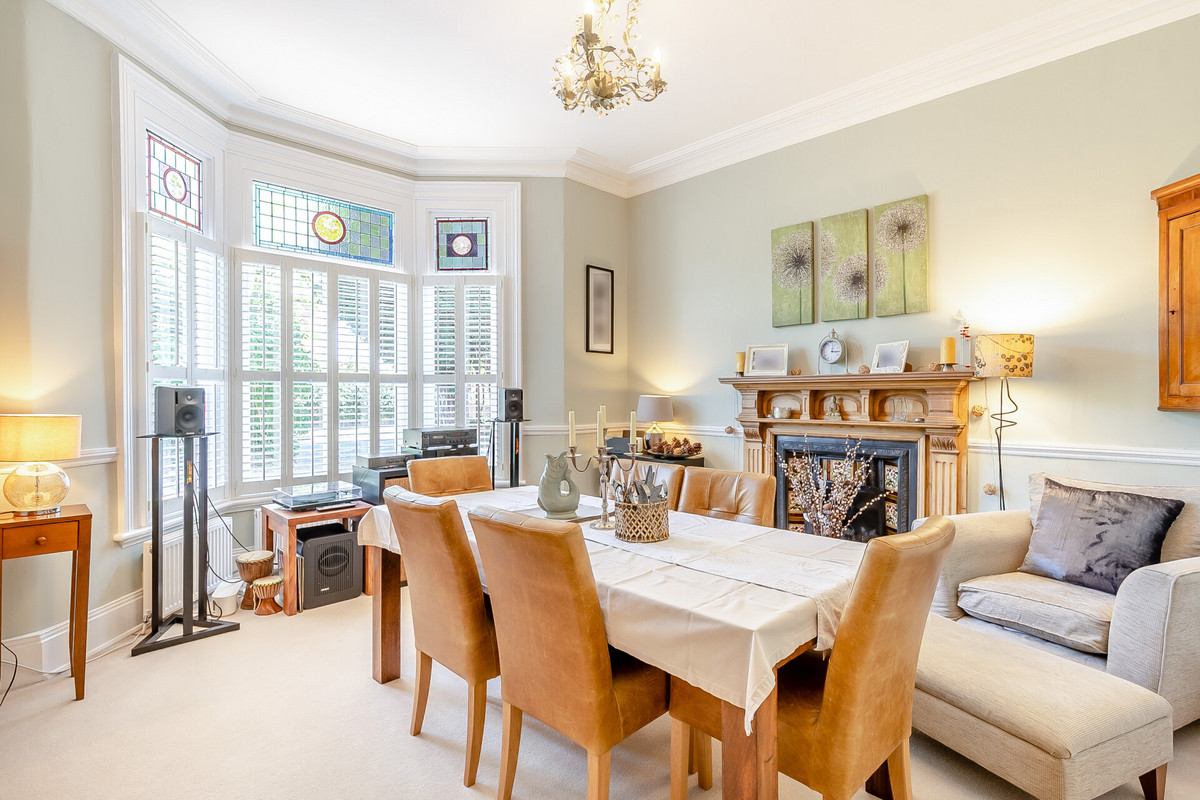 Fairview features three elegant reception rooms, the first of which is located at the front of the property. This room, currently used as the family dining room, showcases original stained glass windows around the top of the bay. A sophisticated space perfect for special occasions and family gatherings, it includes a feature Victorian fireplace with a fully working gas fire, fabulous high ceilings, and immaculate original plasterwork, complemented by the recent addition of smart fitted plantation shutters for a contemporary touch.