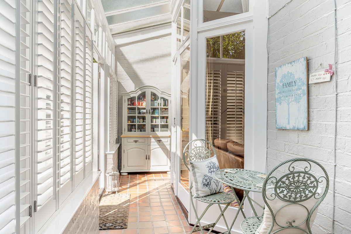 Leading off both the kitchen and rear living room is the delightful orangery—a serene breakfast space with quarry-tiled flooring, plantation shutters, and double French doors opening directly onto the spacious raised terrace. A laundry room is accessed from the orangery, with ample space for a large fridge freezer, washing machine, and dryer. The inner hall between the kitchen and breakfast room also offers a back door to the side courtyard and a guest WC, featuring beautiful tiled walls, original stained glass, and stylish fittings.
