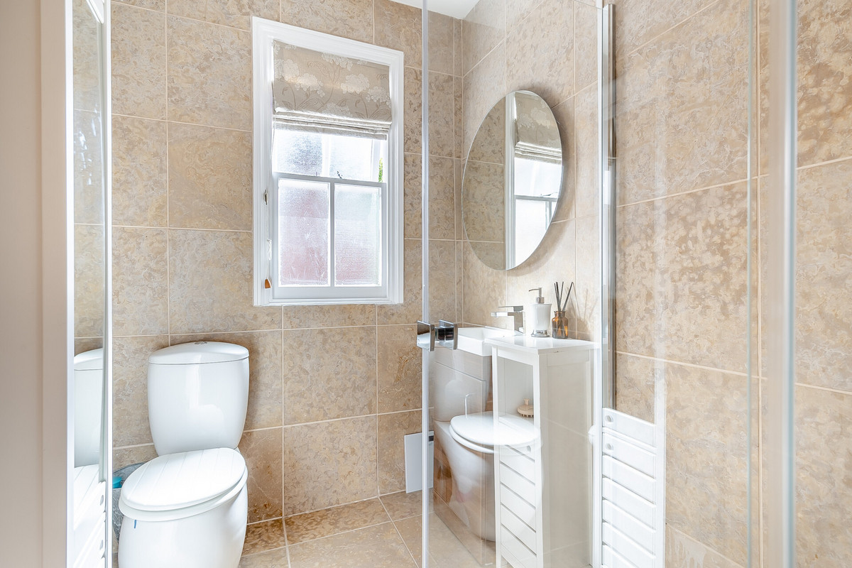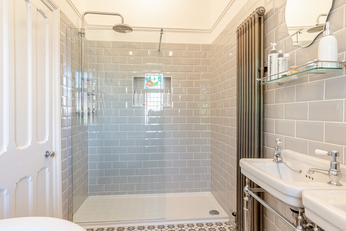 Also on this floor are two further generously sized double bedrooms, both overlooking the rear garden. Each is tastefully decorated, showcasing original fireplaces, period features, and refined finishes. One bedroom benefits from extensive floor-to-ceiling fitted wardrobes along two walls. These bedrooms are served by a sleek, contemporary shower room, fully tiled from floor to ceiling and featuring under-floor heating, a spacious walk-in shower, WC, and hand basin.