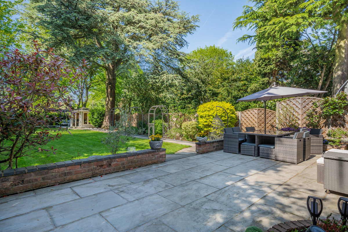 A wrought iron gate, framed by a mature Montana Clematis arch, leads from the courtyard to a spacious elevated rear terrace. This generous grey sandstone patio, bordered by a low retaining wall, is ideal for outdoor dining and entertaining. Wide central steps descend to the main lawn, which is flanked by a broad pathway leading to a summer house and a lower decked seating area.
