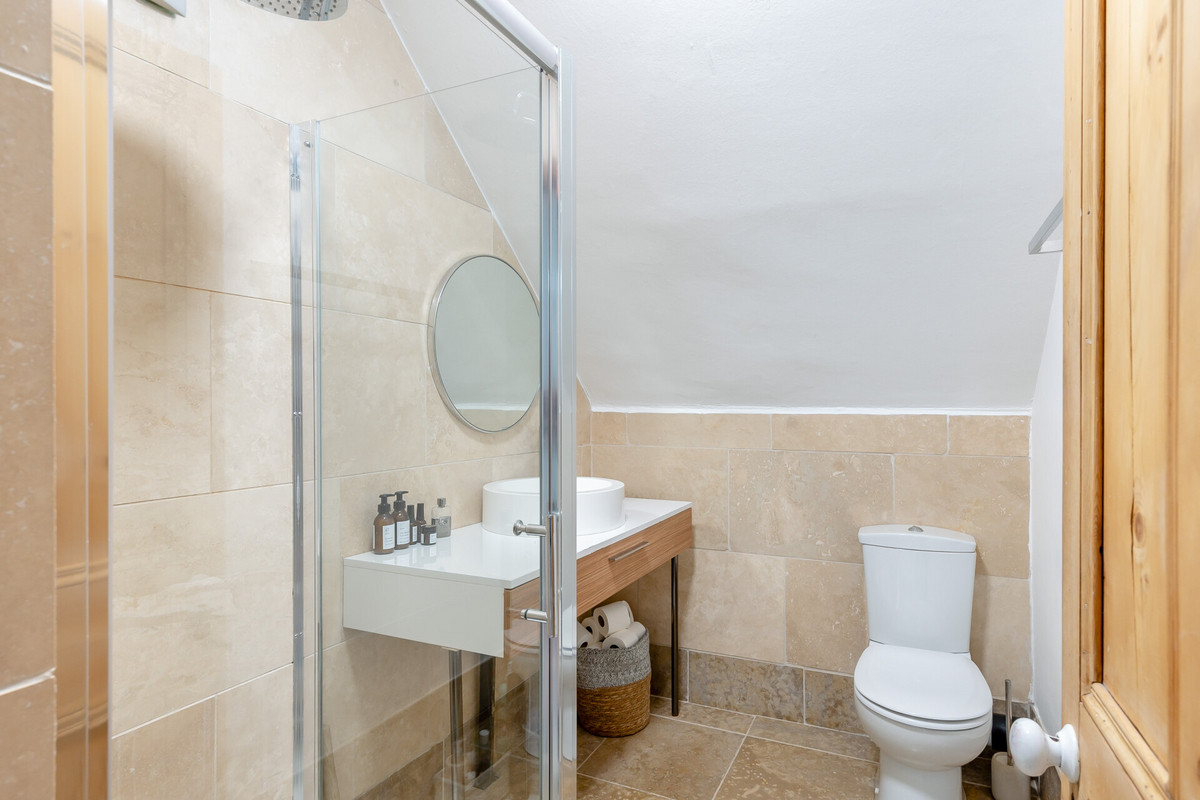 Also on this floor is a stylish shower room, finished with elegant limestone tiling and featuring a rain-head shower, WC, and hand basin. The landing is illuminated by a lantern roof light, flooding the space with natural light.