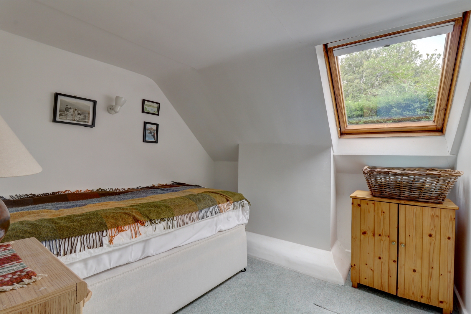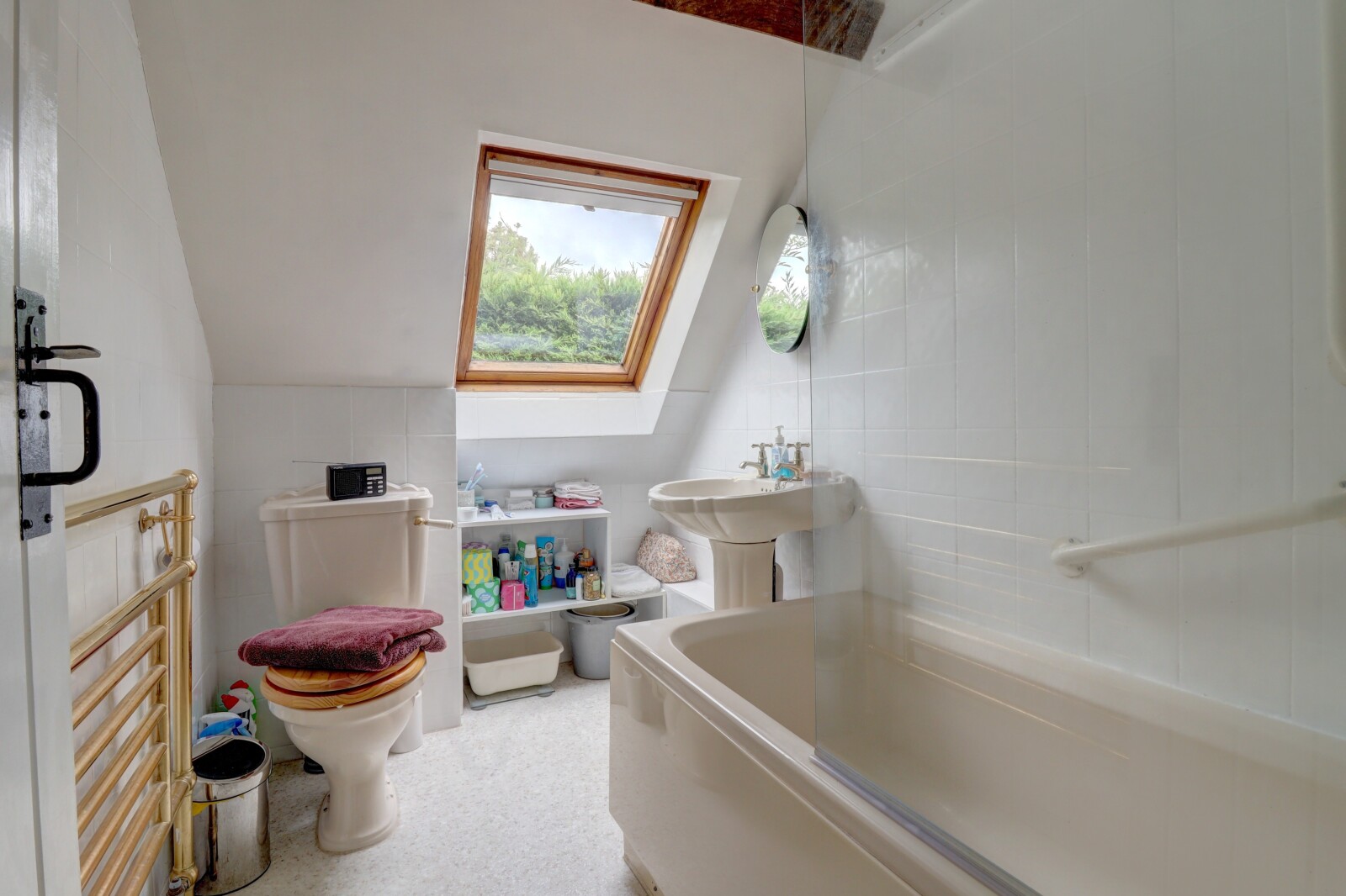 Upstairs, a landing leads to three bedrooms. The main bedroom, overlooking the garden, enjoys a peaceful outlook, while the second sits to the front of the cottage. The third benefits from a skylight with a view over the side garden. A family bathroom with bath, shower, wash basin, and WC completes the first floor.