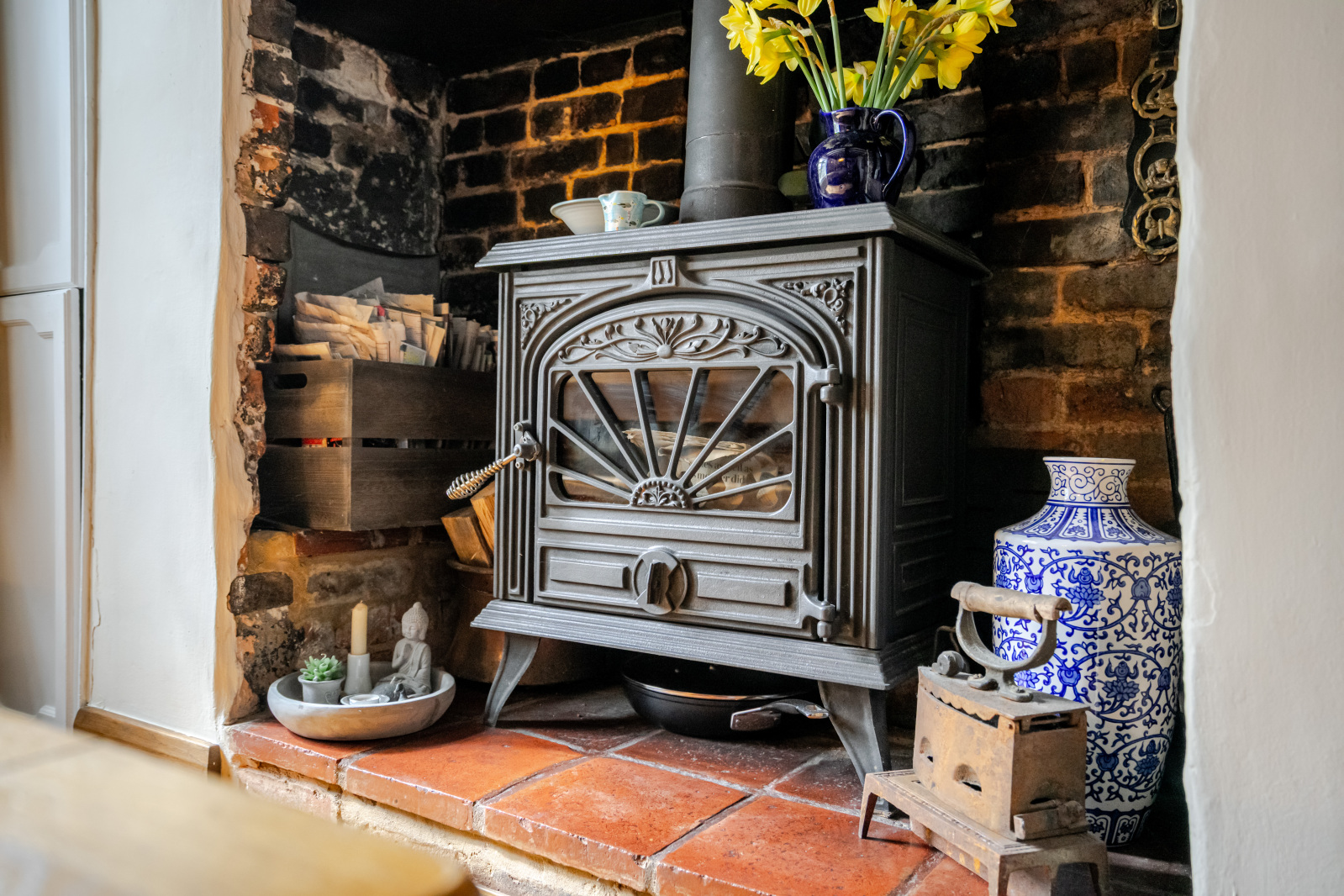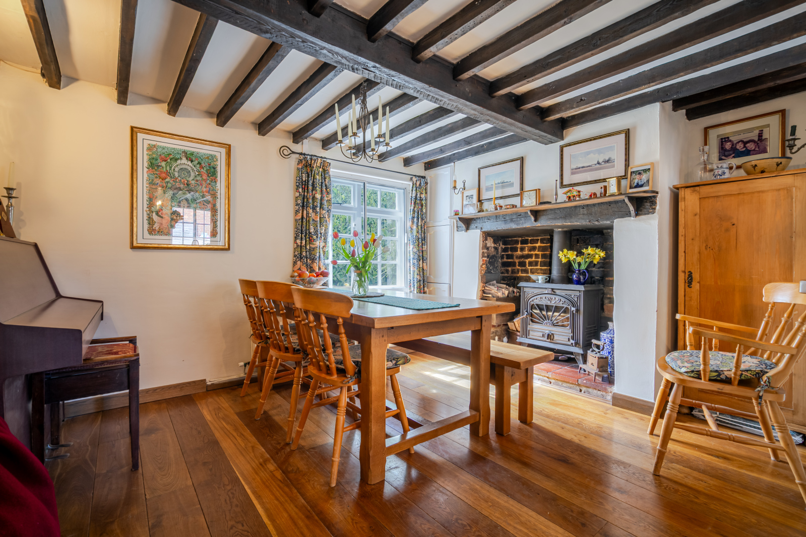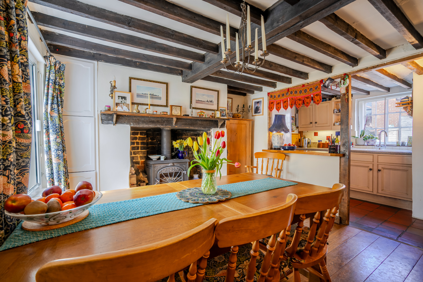 Inside, the home offers three distinctive reception rooms, each with its own fireplace, adding both function and charm. The elegant sitting room opens out onto the garden through classic French doors, while the centrally located, dual-aspect living room boasts a striking feature fireplace perfect for cozy evenings. The dining room is a characterful space, complete with a large wood-burning stove nestled in the original hearth and a timber-beamed breakfast bar that seamlessly connects to the kitchen, offering a sociable layout for family life and entertaining.