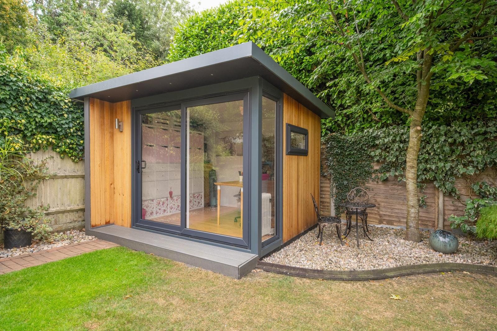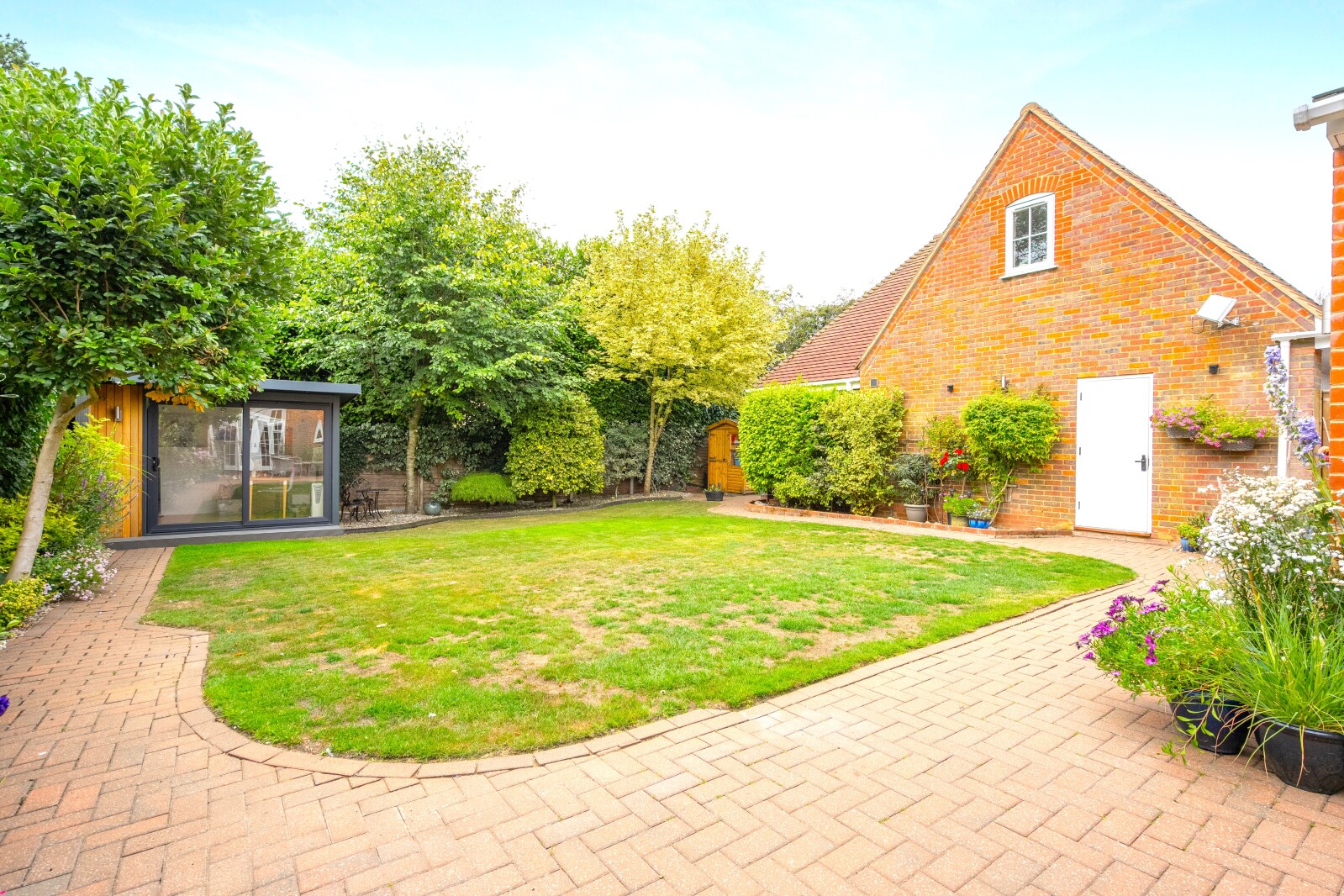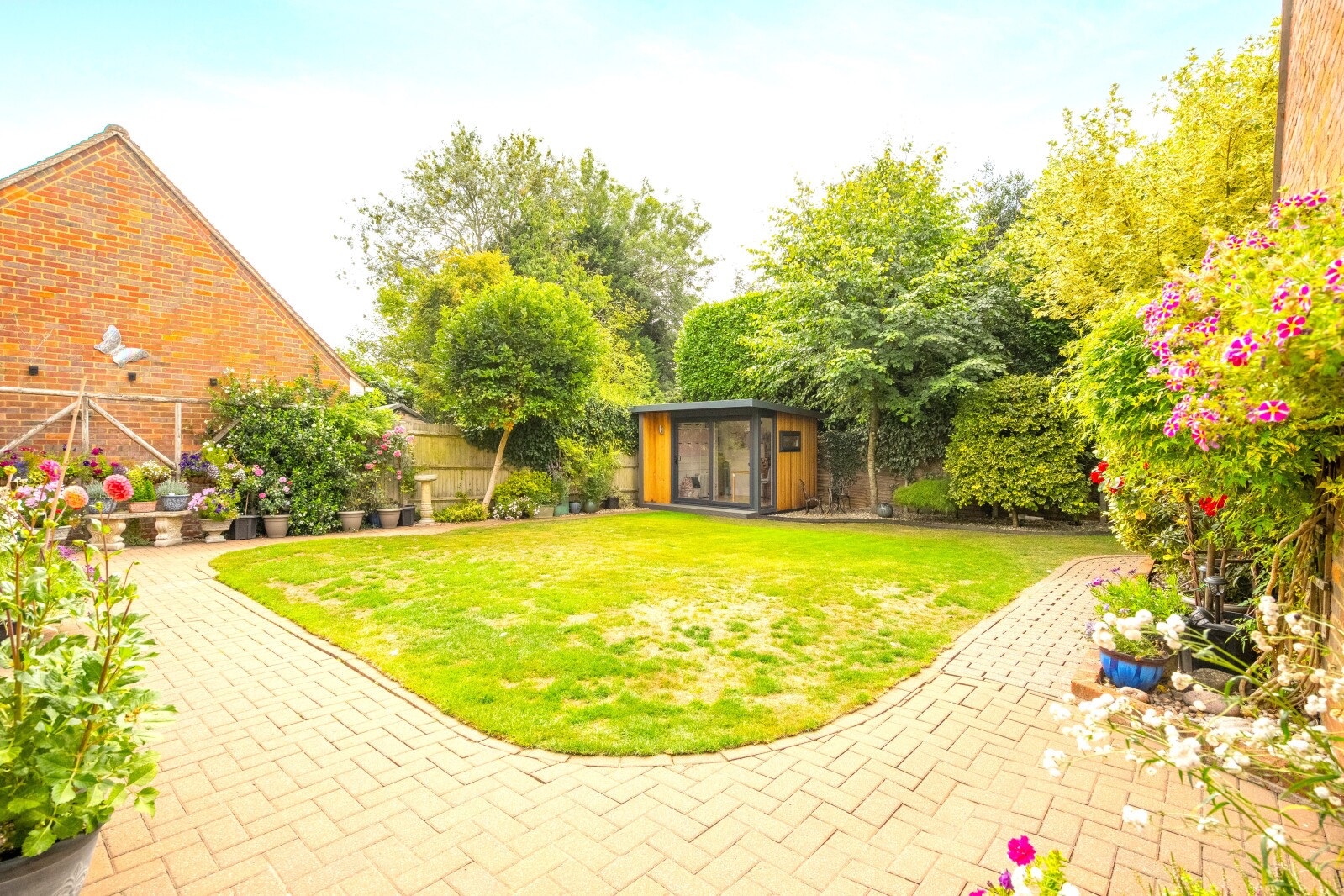 The landscaped rear garden enjoys a sunny southerly aspect, with lawn areas, mature planting, a newly built garden room and a patio terrace ideal for al fresco dining. To the front, the property benefits from ample driveway parking and a double garage with light, power, and an electric up-and-over door.