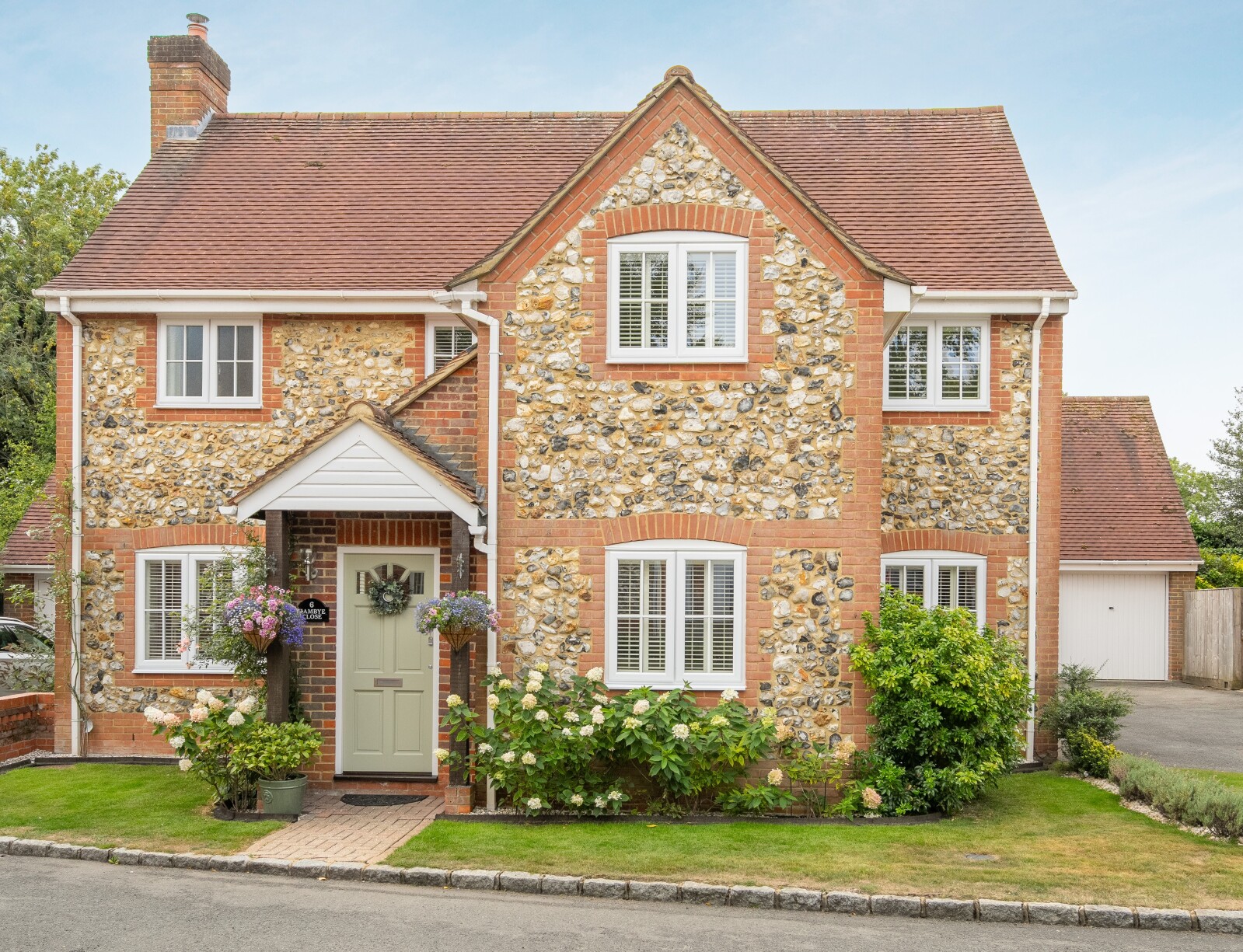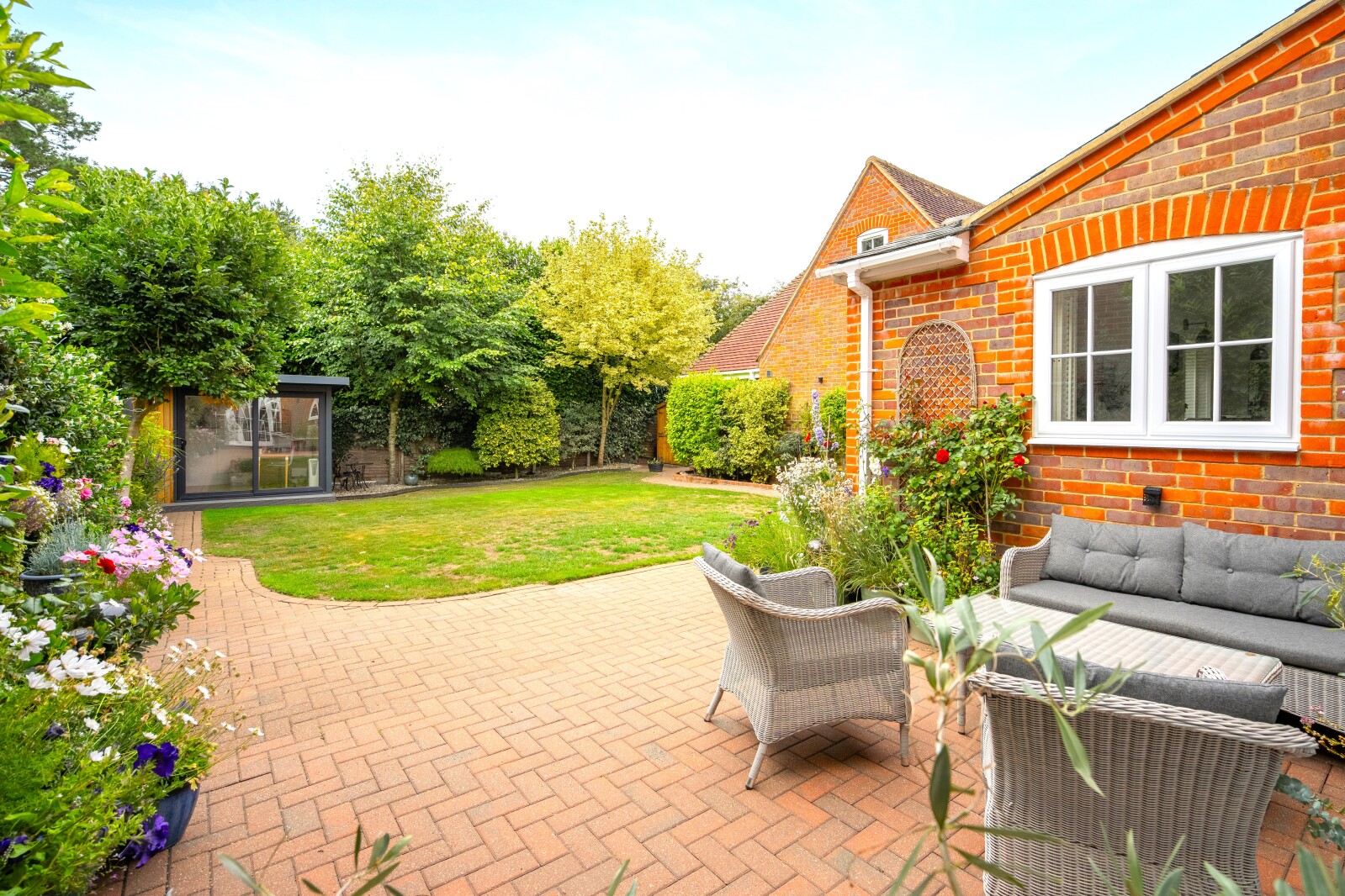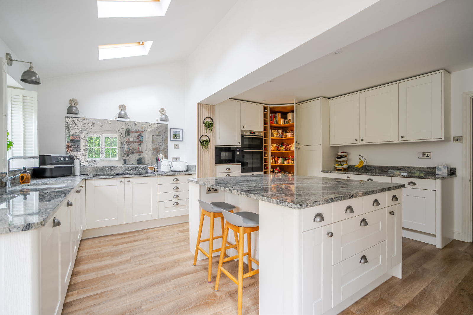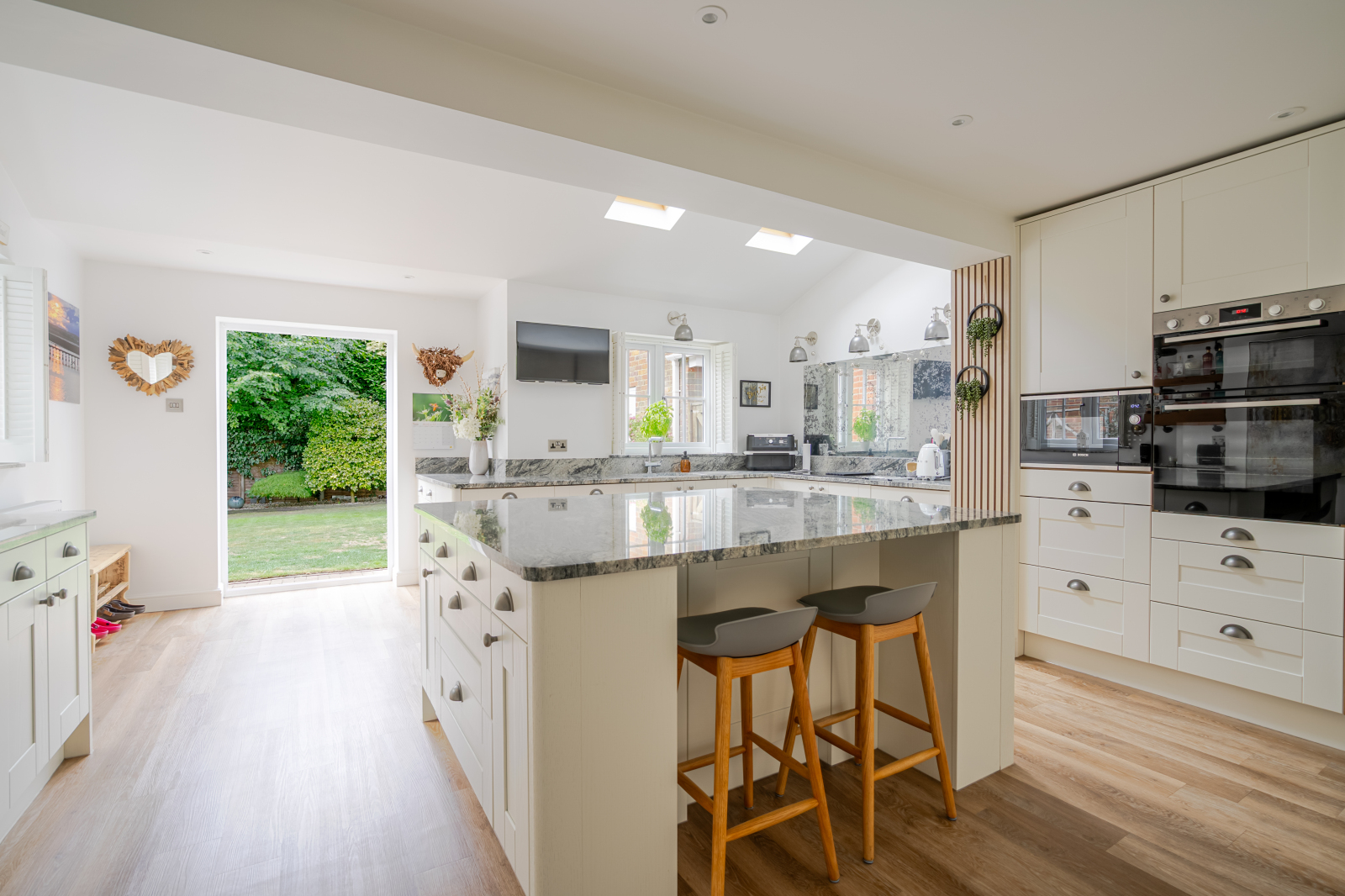 The welcoming reception hall sets the tone for the home, flowing seamlessly through to the cloakroom and the striking kitchen with central island and breakfast bar. The double-aspect sitting room enjoys a fireplace and French doors leading directly to the rear patio, perfectly framing the southerly garden views. The kitchen is partly vaulted for extra light and space and fitted with granite work surfaces and ample cupboard storage space, and integrated appliances. An adjoining utility room provides further storage and workspace. The ground floor also features a formal dining room and a study, ideal for working from home.