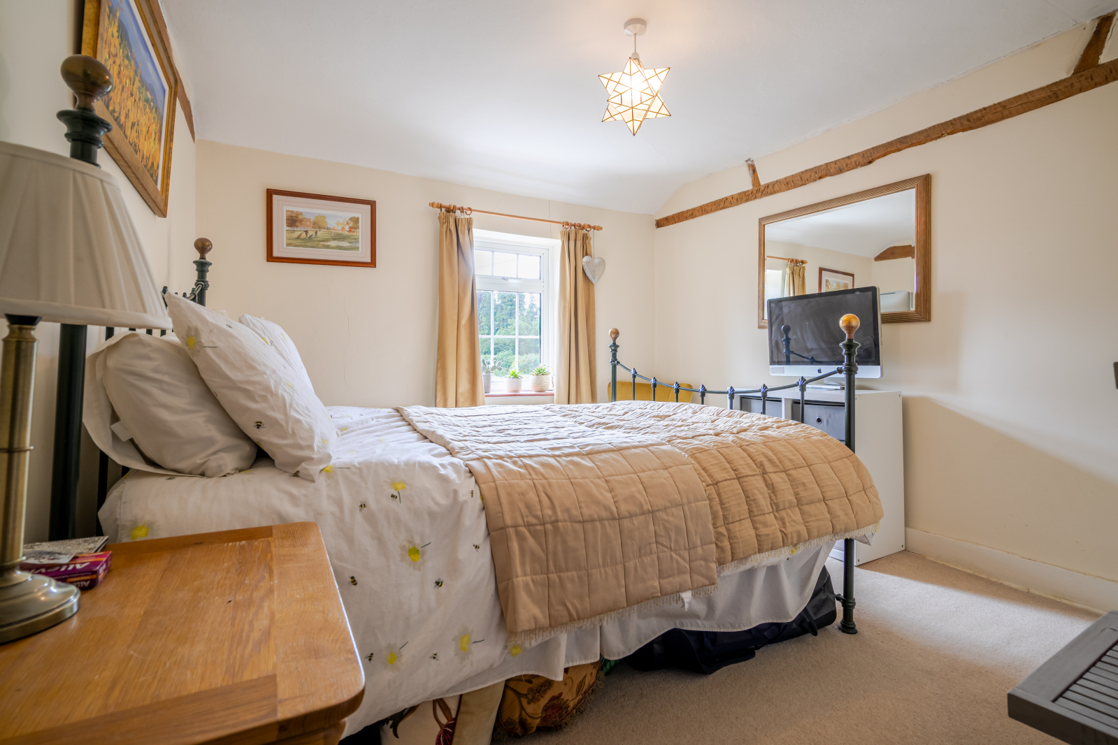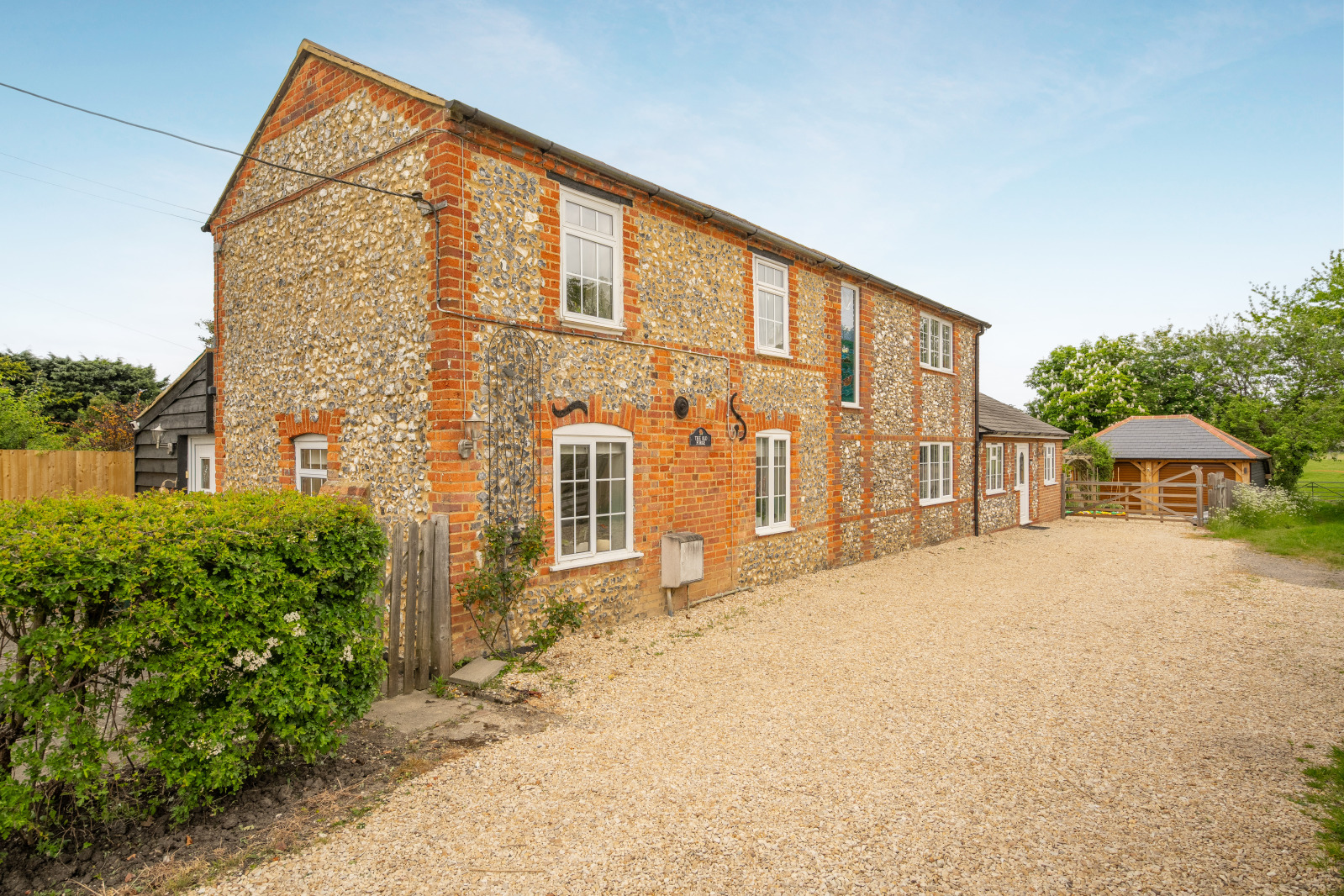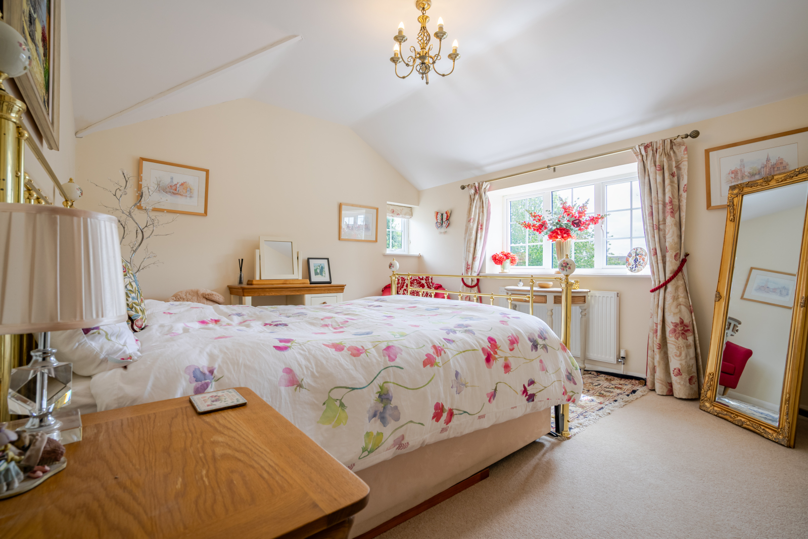 A detached double garage with roller shutter doors and a pitched roof adds further practicality and could lend itself to workshop or studio use if desired. The rear of the property enjoys uninterrupted views over open fields, providing a tranquil backdrop and a true sense of rural living.