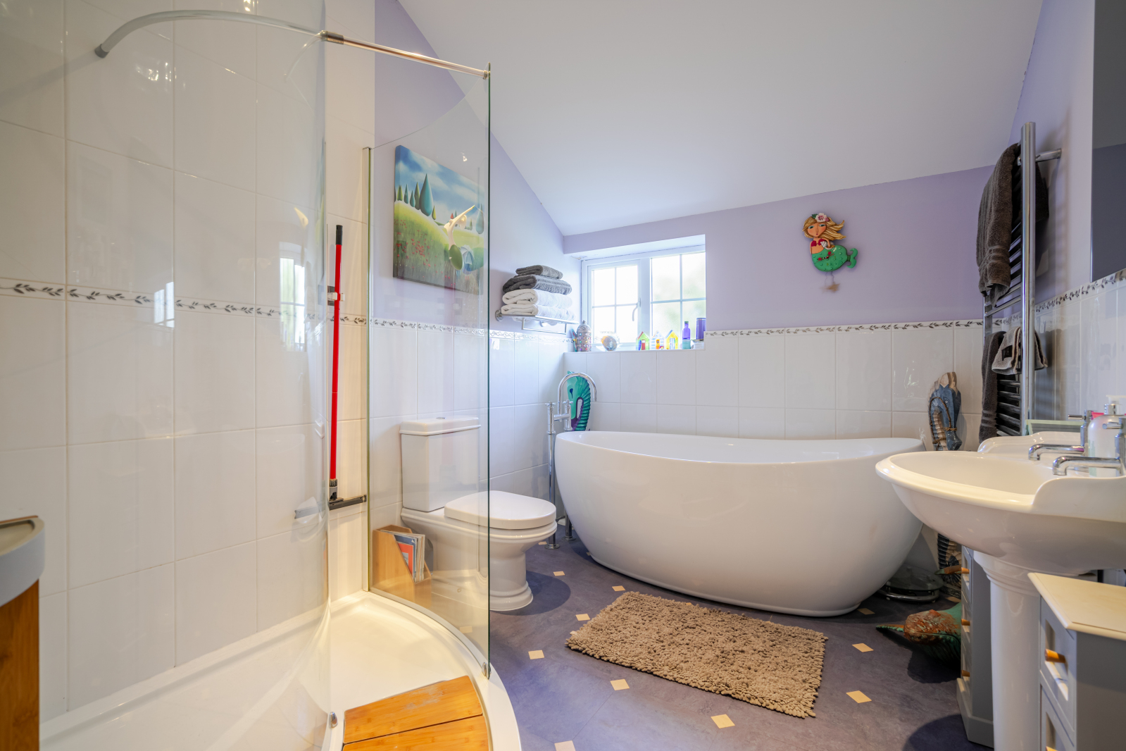 Upstairs, five well-proportioned bedrooms are arranged around a central landing. The principal suite boasts a luxurious en suite bathroom and a generous walk-in dressing room. The remaining bedrooms are served by a spacious family bathroom, finished to a high standard and perfect for busy households.