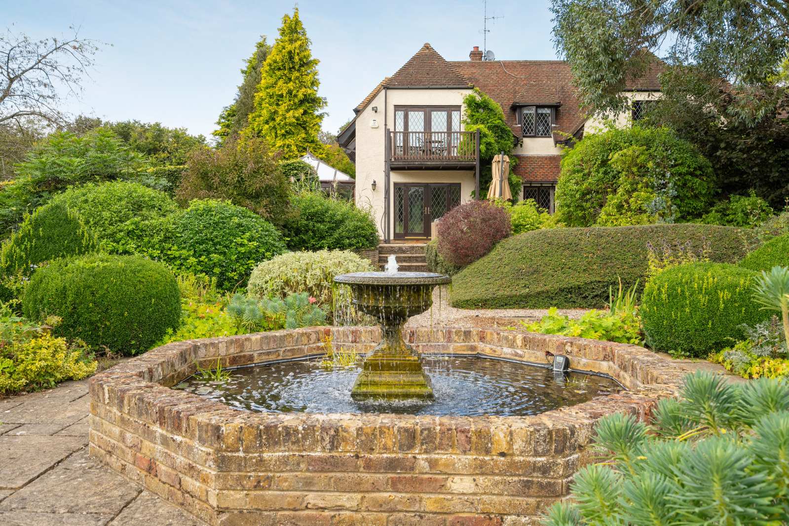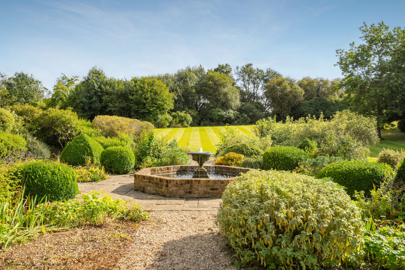 A charming pond also adds a touch of tranquillity and elegance to the garden, creating a delightful space to relax and enjoy nature.