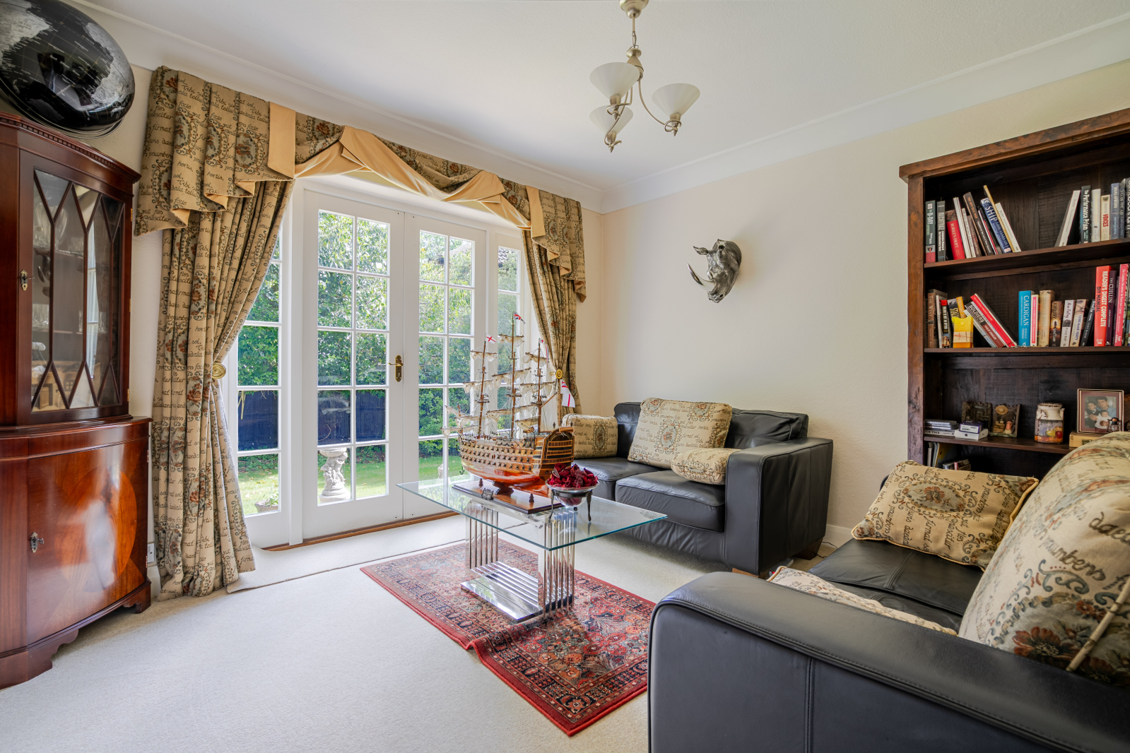 The heart of the home is the stunning 26ft triple-aspect drawing room, featuring an impressive open brick fireplace and tranquil views of the landscaped gardens on all sides. Additional living spaces include a family room, reading room, a generous kitchen/breakfast room, utility room, and a formal dining roomall beautifully appointed and practical in layout.