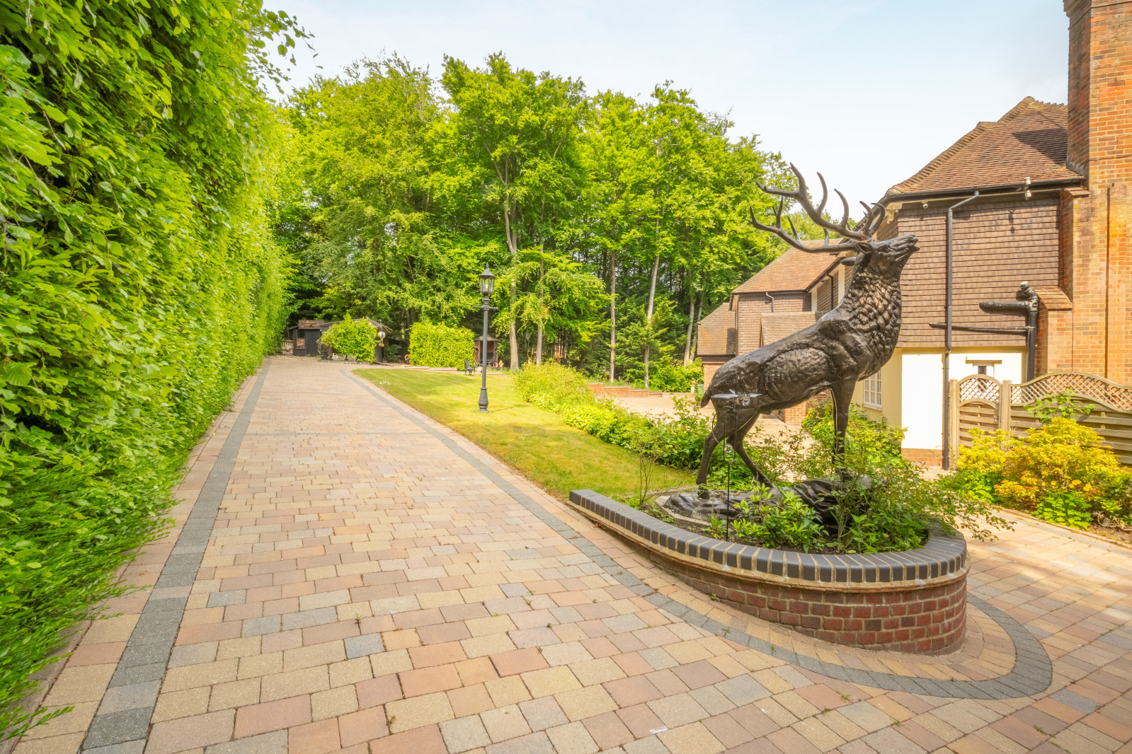 A sweeping block paved driveway behind gates leads to the property, offering ample off-street parking. There is also a double integral garage, ideal for car enthusiasts or additional storage.