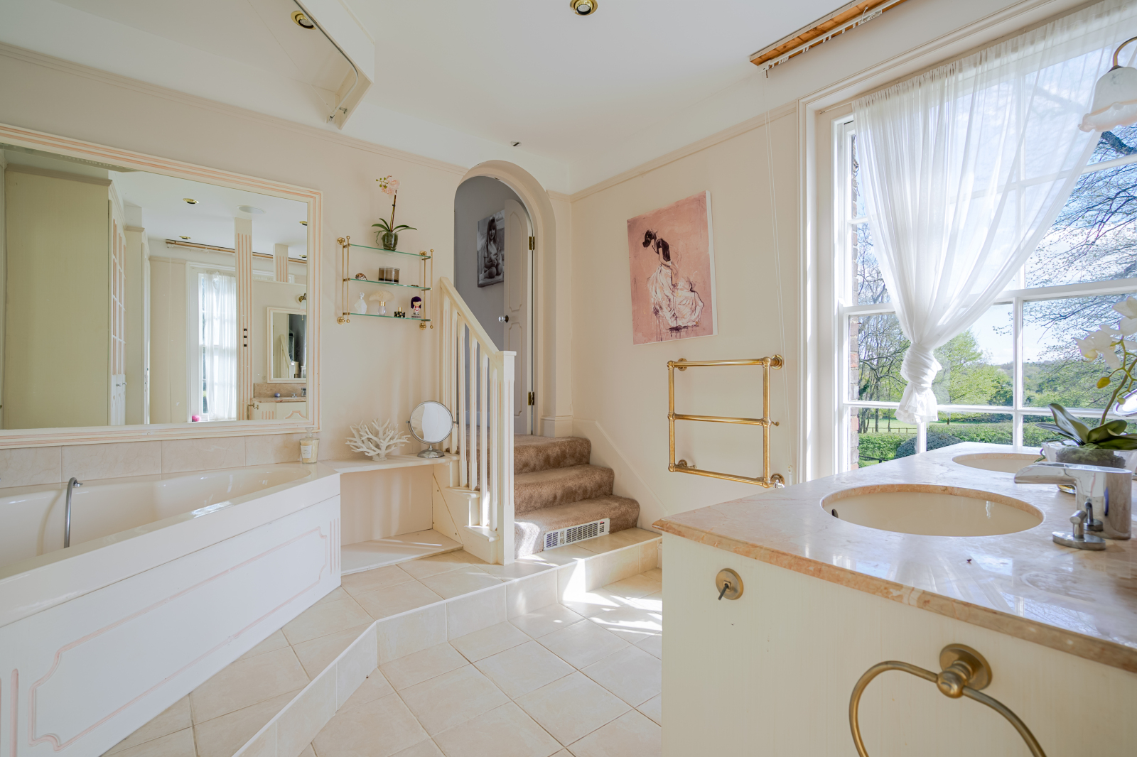 The Georgian staircase rises to three bedrooms and a family bathroom. Bedroom two benefits from an en suite and direct access to a balcony overlooking the grounds. The family bathroom features traditional styling with tongue-and-groove panelling and a classic high-level WC.