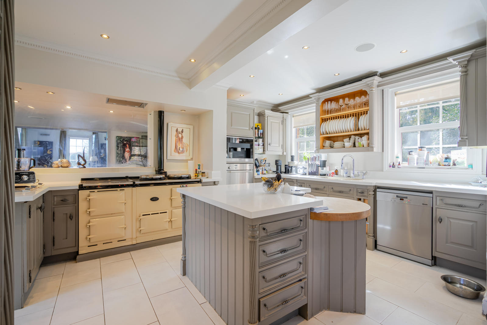 The grand front door leads into a bright lobby and hallway with the sweeping central staircase. Reception rooms include the elegant drawing room featuring floor-to-ceiling sash windows, original coving, and a grand fireplace and the former dining room (now a treatment room), both showcasing classic period details. The impressive kitchen/breakfast room is accessed through the boot room or directly from the drive via stone balustraded steps. Fitted with bespoke Mark Wilkinson cabinetry and high-end appliances, the kitchen flows into a dining area beneath a vaulted ceiling, with French doors opening onto the gardens.