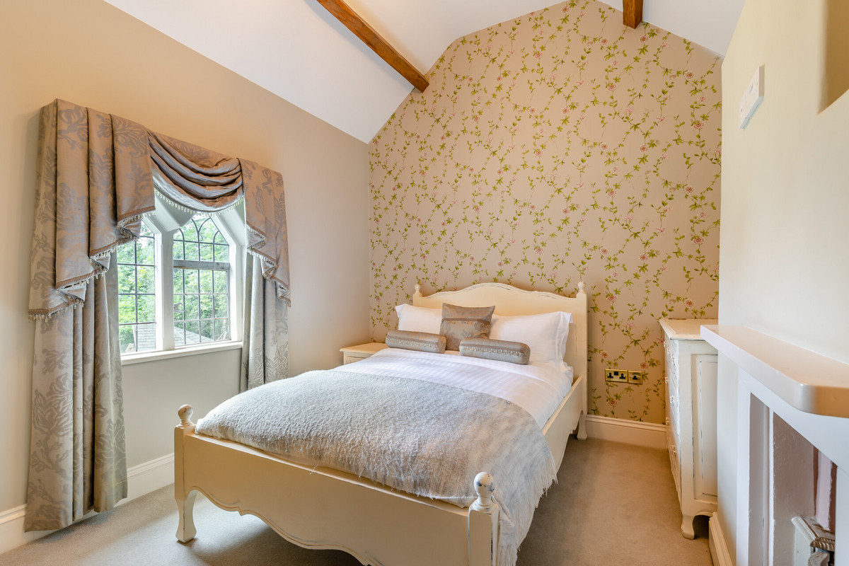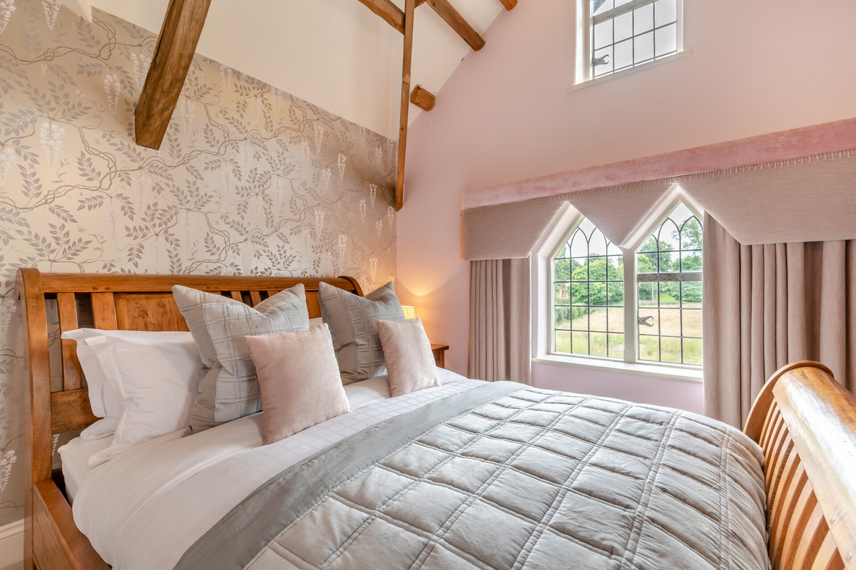 • Double Bedroom 1: Dual aspect, original A-frame beams, high gable window.