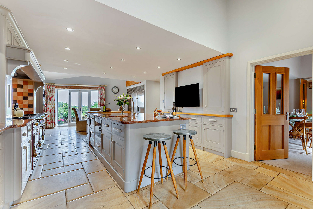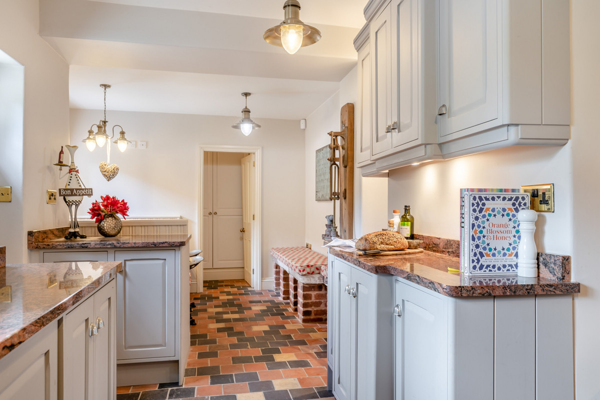 • Kitchen Diner: Bespoke handmade light grey kitchen with granite work surfaces, quarry-tiled floor, integrated dishwasher, Belfast sink, two undercounter fridges, La Cornue range cooker, and a breakfast area.