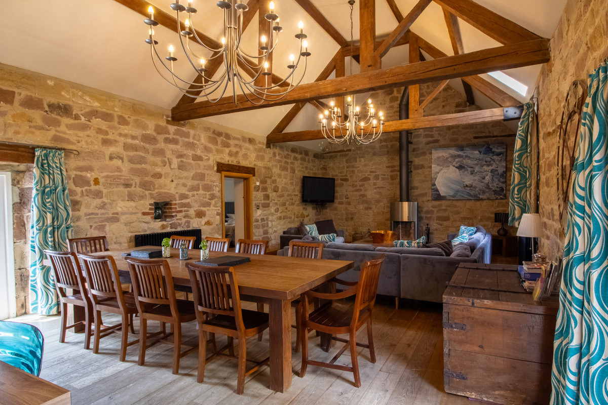 A stunning barn conversion sleeping 10 guests across five double bedrooms, each with bespoke en-suite facilities. The open-plan kitchen, dining, and lounge area boasts towering oak beams, contemporary chandeliers, and state-of-the-art kitchen appliances.