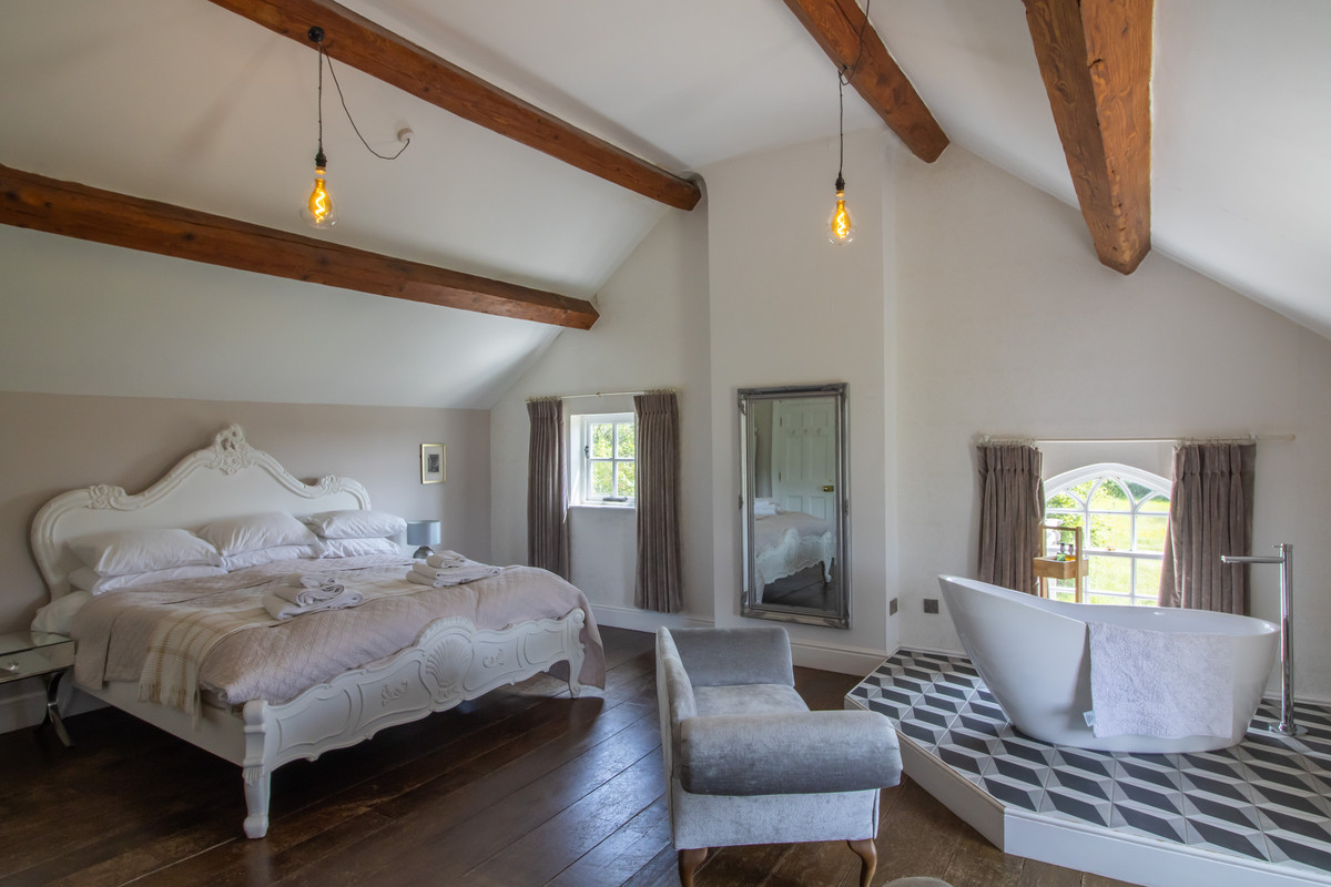 - High-spec finishes throughout, including bespoke kitchens, oak beams, en suites in all major bedrooms, and chic rustic décor.