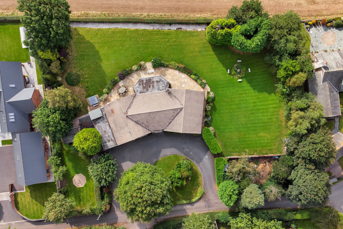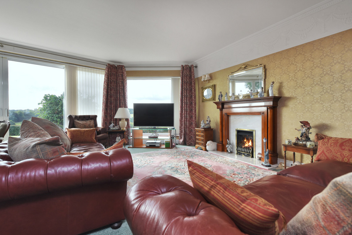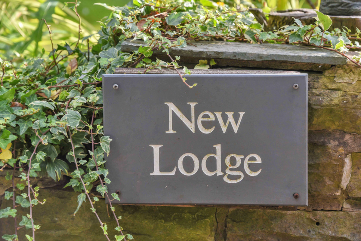 New Lodge is approached via an impressive sweeping tarmac in-out driveway, offering ample parking for multiple vehicles alongside a spacious carport and integral double garage. The frontage is beautifully framed by a lawned area with stone walling and mature shrubs, providing a sense of privacy and seclusion from the road.